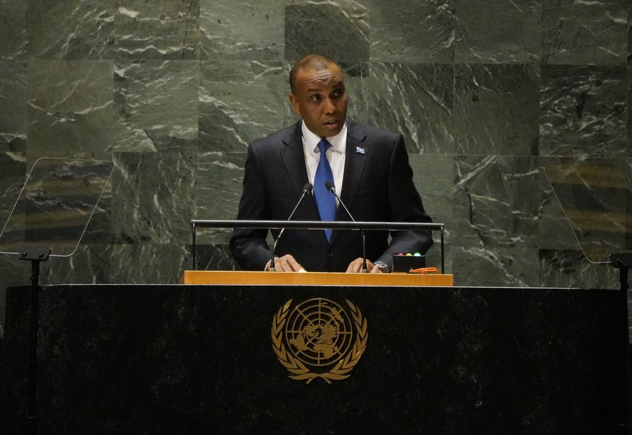 Hamza Abdi Barre, prime minister of Somalia, delivers a speech at the General Debate of the 78th session of the UN General Assembly at the UN headquarters in New York, Sept. 23, 2023. (Xinhua/Wu Xiaoling)