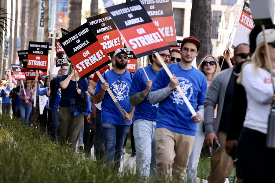 Entertainment industry writers demonstrate in Hollywood, Los Angeles, the United States, on May 2, 2023. (Xinhua)