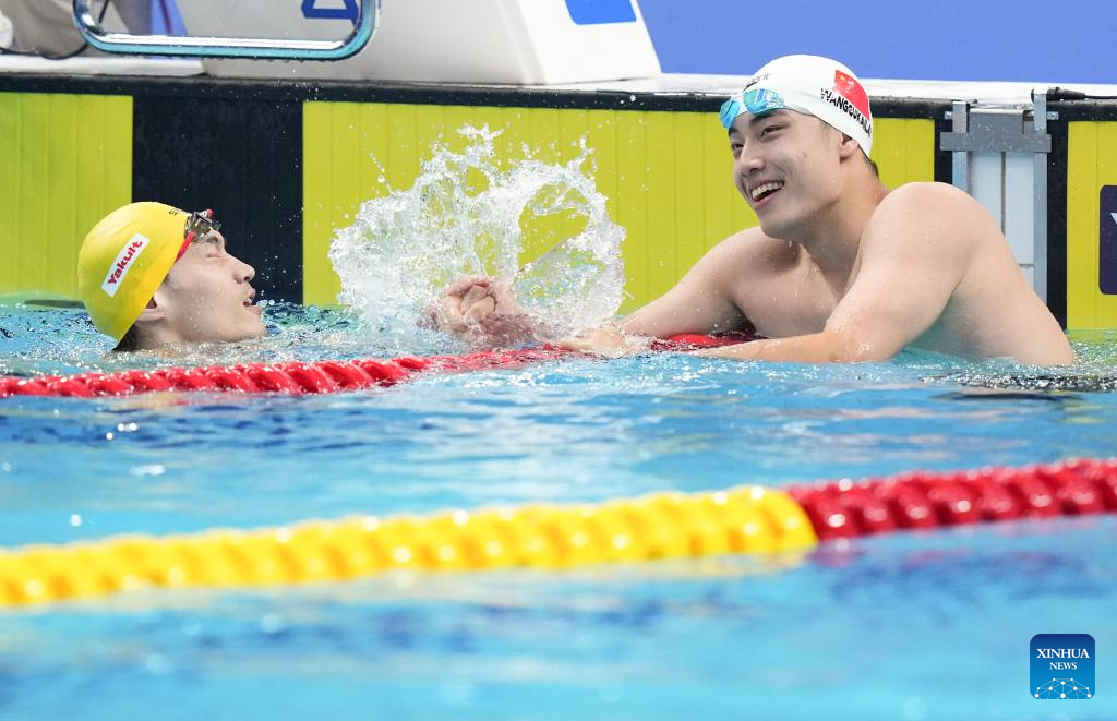 Xu Jiayu (L) and Wang Gukailai of China celebrate after the Men's 50m Backstroke Final at the 19th Asian Games in Hangzhou, east China's Zhejiang Province, Sept. 25, 2023. (Xinhua/Du yu)
