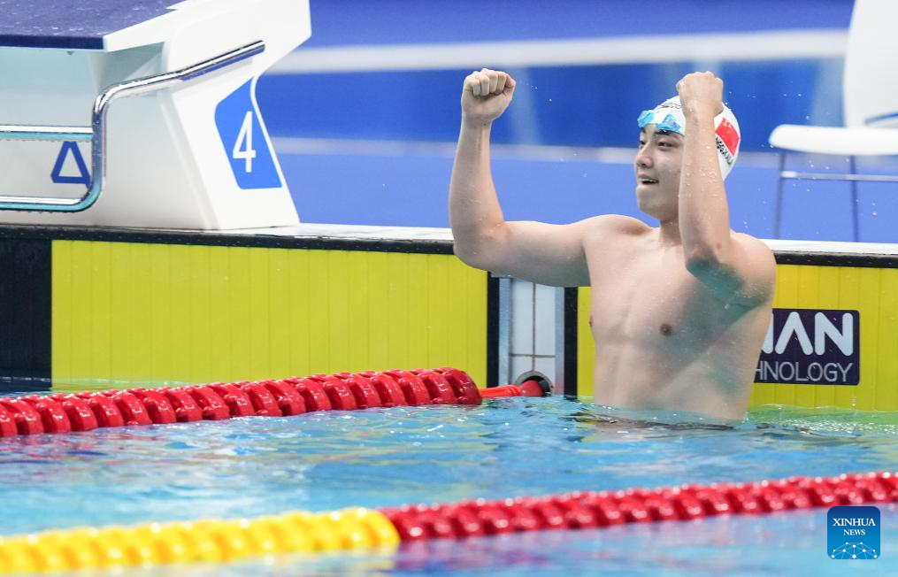 Xu Jiayu of China celebrates after the Men's 50m Backstroke Final at the 19th Asian Games in Hangzhou, east China's Zhejiang Province, Sept. 25, 2023. (Xinhua/Du yu)