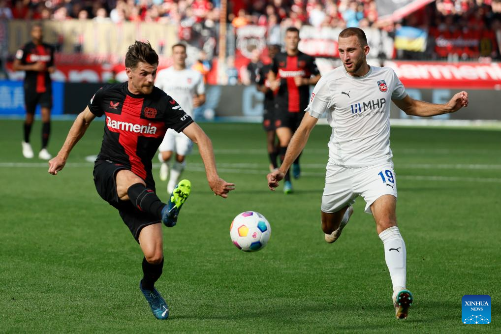 Robert Andrich (L) of Bayer 04 Leverkusen vies with Florian Pick of FC Heidenheim during the first division of Bundesliga 5th round match between Bayer 04 Leverkusen and FC Heidenheim in Leverkusen, Germany, Sept. 24, 2023. (Photo by Joachim Bywaletz/Xinhua)