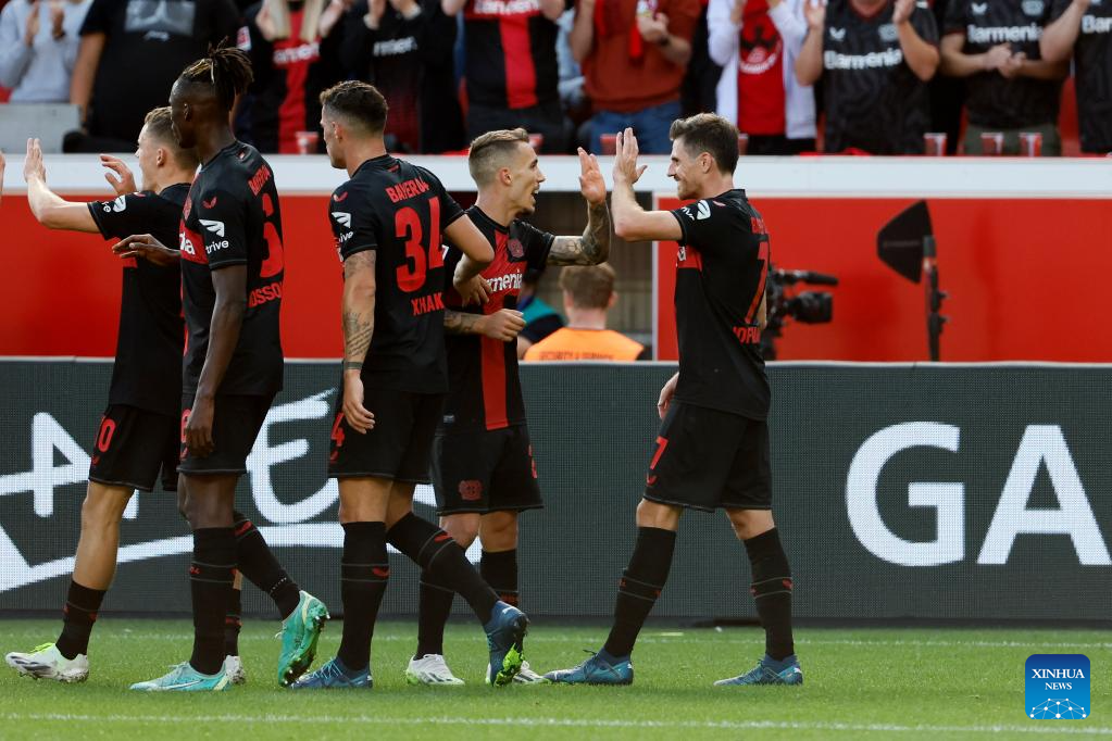 Players of Bayer 04 Leverkusen greet the audience after winning the first division of Bundesliga 5th round match between Bayer 04 Leverkusen and FC Heidenheim in Leverkusen, Germany, Sept. 24, 2023. (Photo by Joachim Bywaletz/Xinhua)