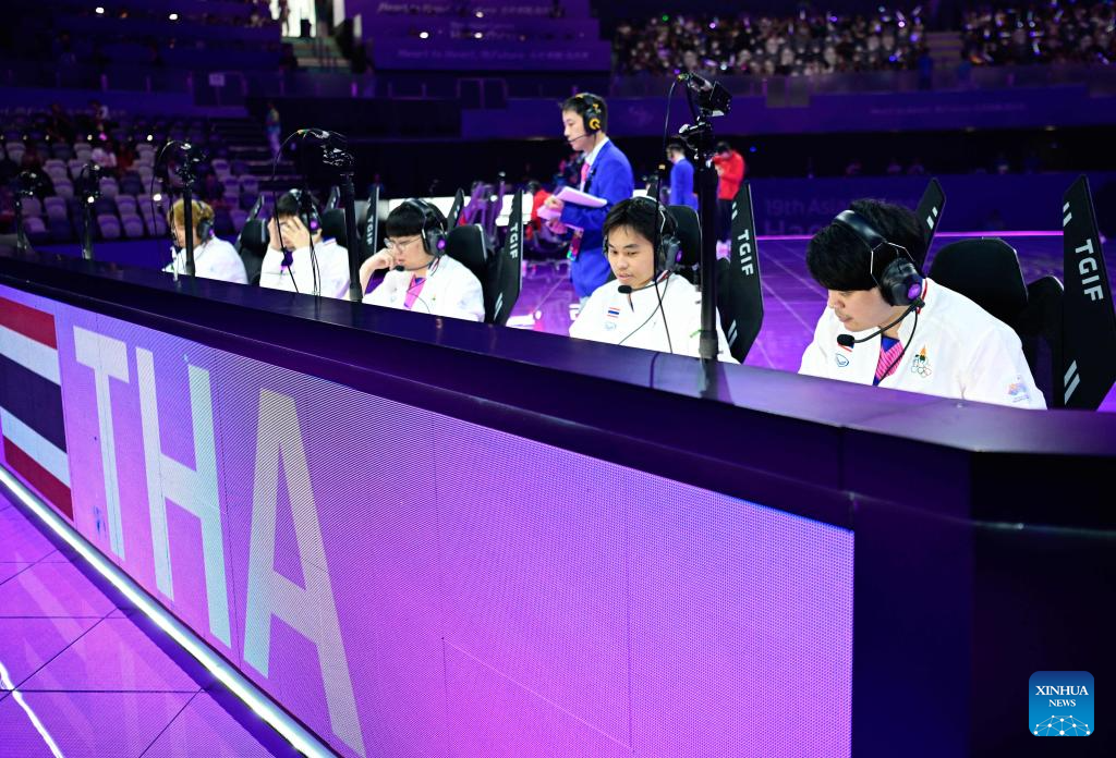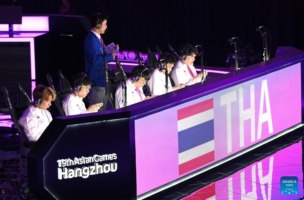 Team Thailand compete during Arena of Valor Asian Games Version Semifinal of Esports at the 19th Asian Games in Hangzhou, east China's Zhejiang Province, Sept. 25, 2023. (Xinhua/Yan Linyun)