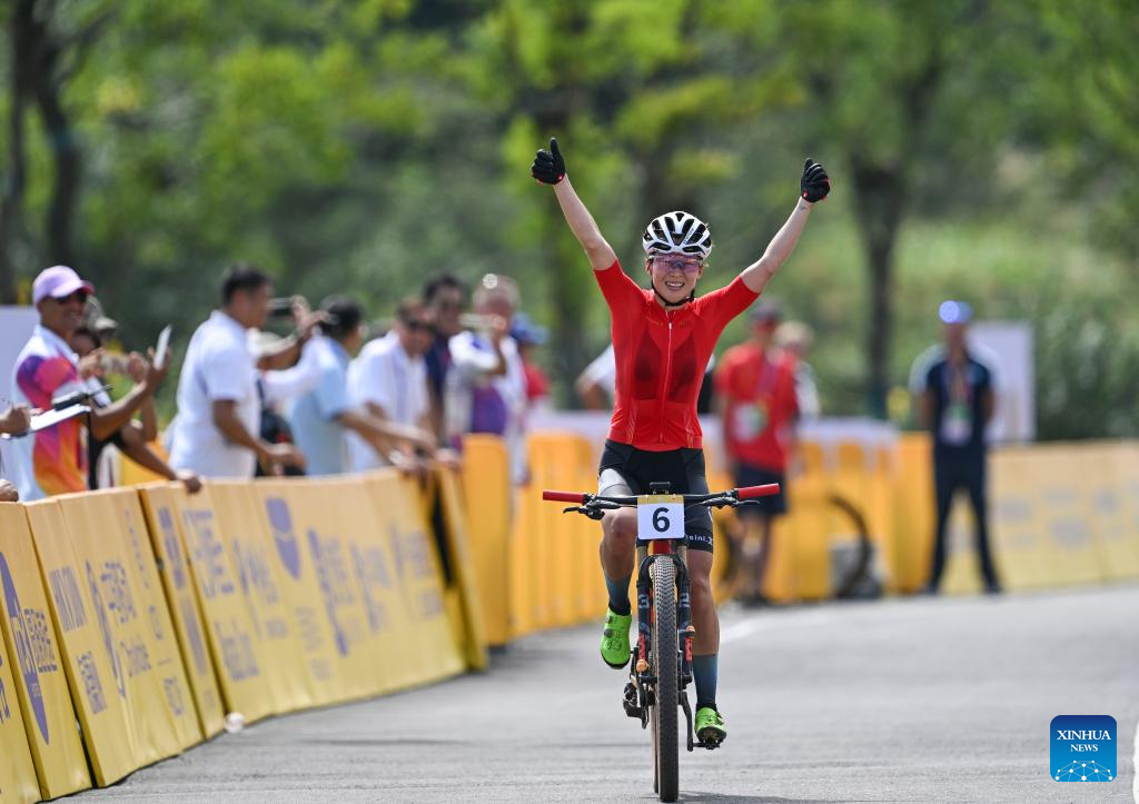 Li Hongfeng of China celebrates after the Women's Cross Country Olympic of Cycling Mountain Bike at the 19th Asian Games in Chun'an County of Hangzhou, east China's Zhejiang Province, Sept. 25, 2023. (Xinhua/Hu Huhu)