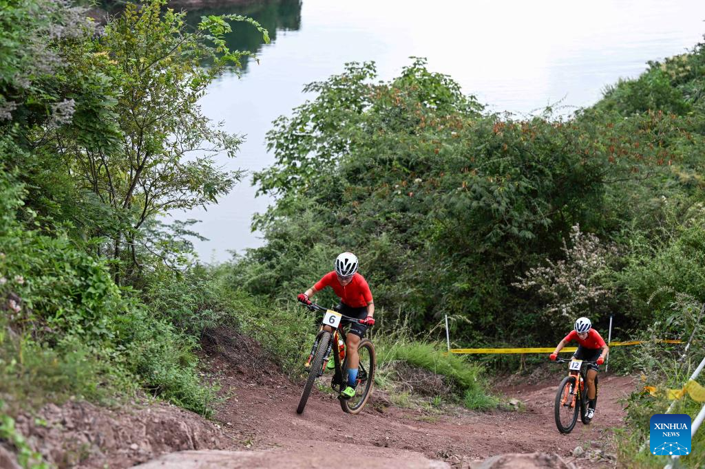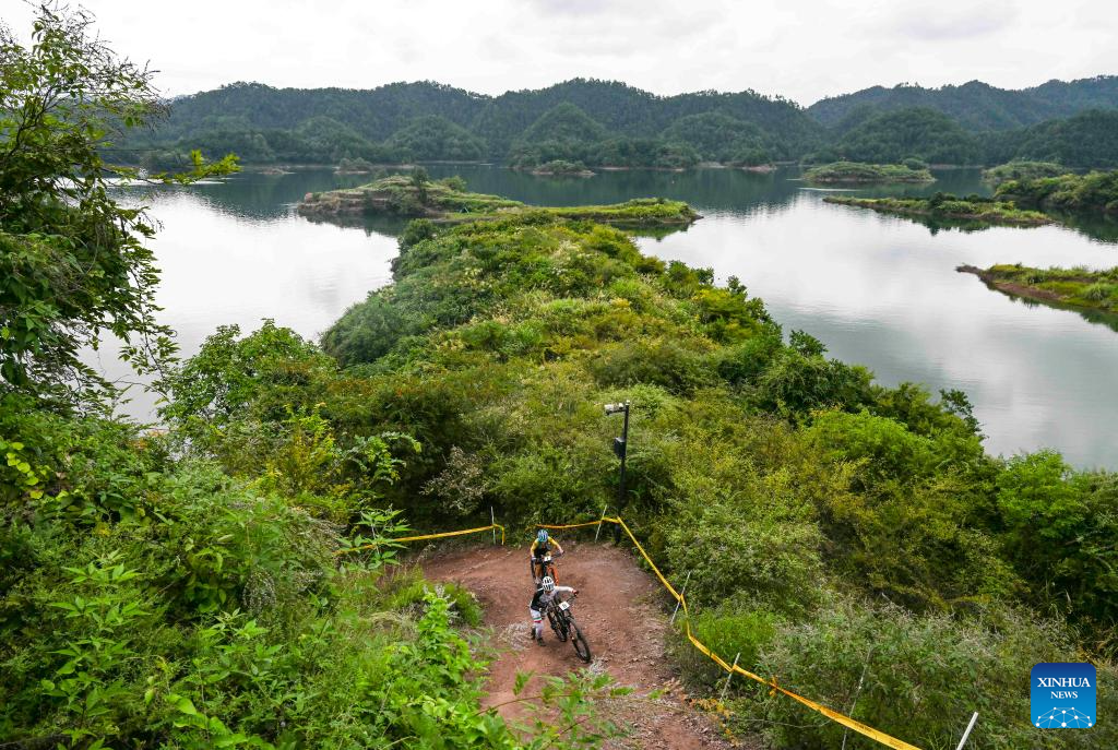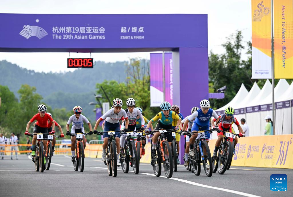 Athletes compete during the Women's Cross Country Olympic of Cycling Mountain Bike at the 19th Asian Games in Chun'an County of Hangzhou, east China's Zhejiang Province, Sept. 25, 2023. (Xinhua/Hu Huhu)