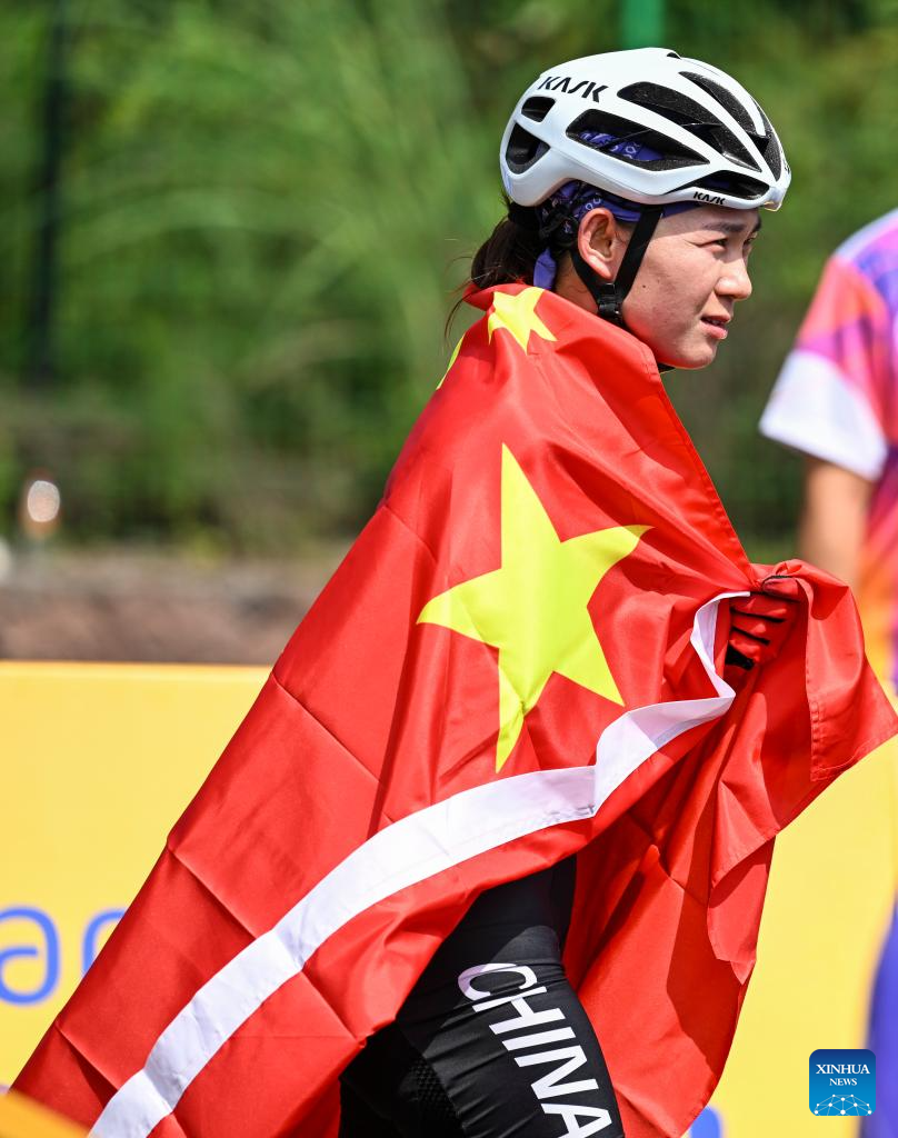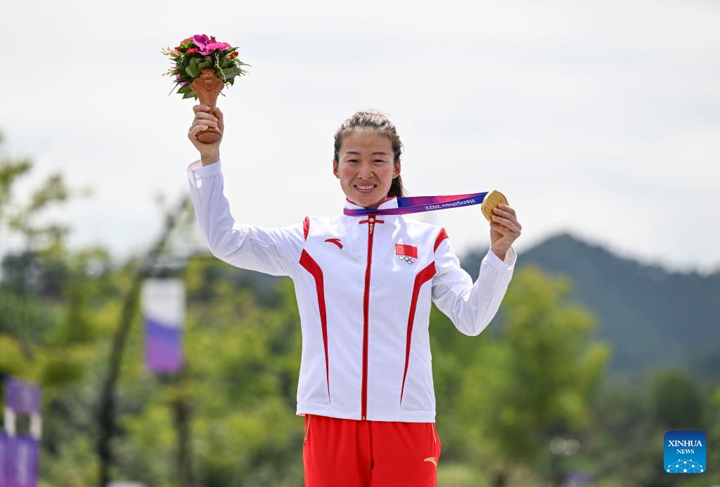 Gold medalist Li Hongfeng of China attends the awarding ceremony for the Women's Cross Country Olympic of Cycling Mountain Bike at the 19th Asian Games in Chun'an County of Hangzhou, east China's Zhejiang Province, Sept. 25, 2023. (Xinhua/Hu Huhu)