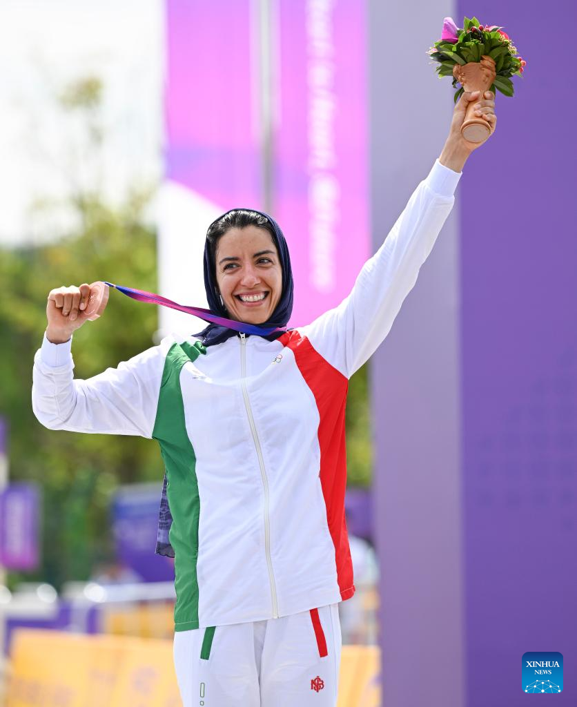 Bronze medalist Faranak Partoazar of Iran attends the awarding ceremony for the Women's Cross Country Olympic of Cycling Mountain Bike at the 19th Asian Games in Chun'an County of Hangzhou, east China's Zhejiang Province, Sept. 25, 2023. (Xinhua/Hu Huhu)