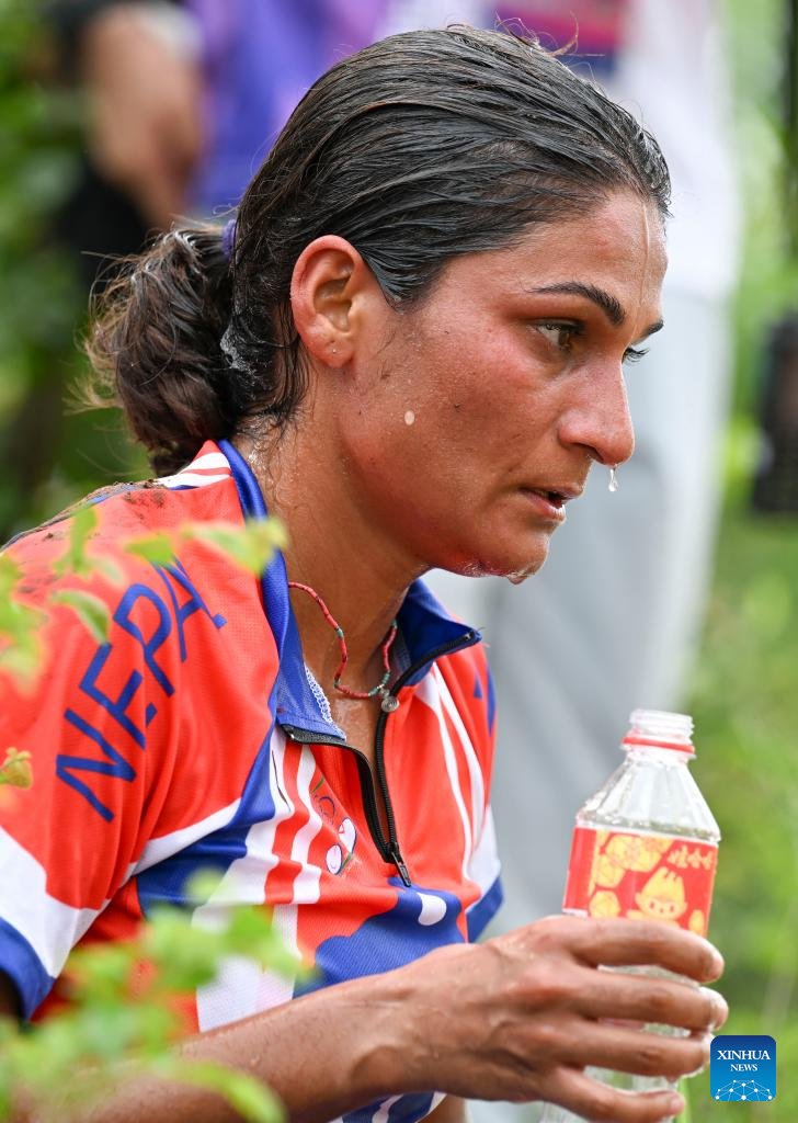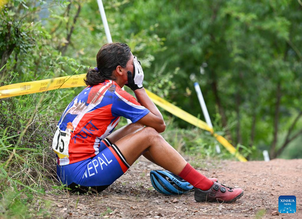 Usha Khanal of Nepal falls during the Women's Cross Country Olympic of Cycling Mountain Bike at the 19th Asian Games in Chun'an County of Hangzhou, east China's Zhejiang Province, Sept. 25, 2023. (Xinhua/Hu Huhu)