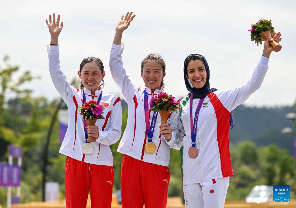 Gold medalist Li Hongfeng (C) of China, silver medalist Ma Caixia (L) of China and bronze medalist Faranak Partoazar of Iran attend the awarding ceremony for the Women's Cross Country Olympic of Cycling Mountain Bike at the 19th Asian Games in Chun'an County of Hangzhou, east China's Zhejiang Province, Sept. 25, 2023. (Xinhua/Hu Huhu)