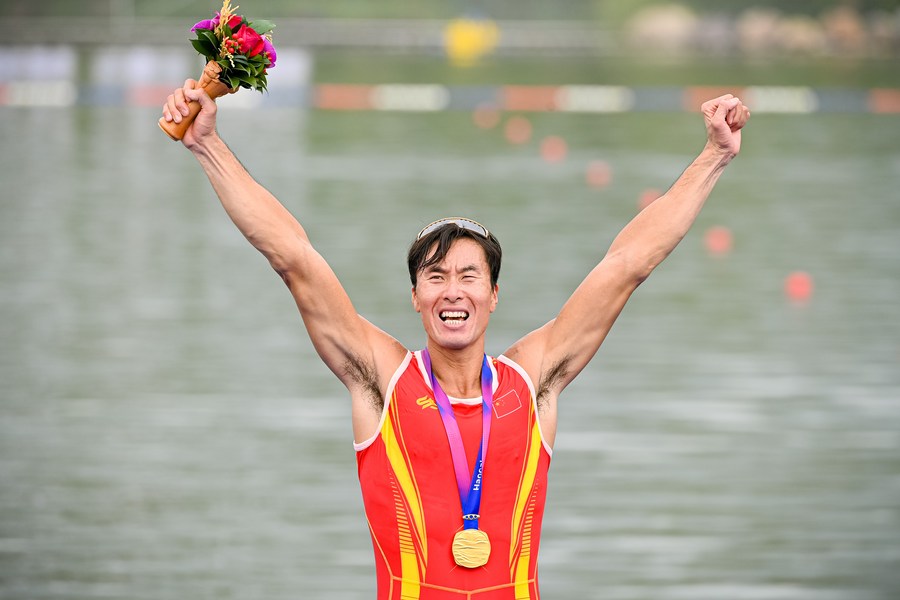 Gold medalist Zhang Liang of China celebrates during the award ceremony for the men's single sculls of rowing at the Hangzhou Asian Games on Sept. 25, 2023. (Xinhua/Jiang Han)