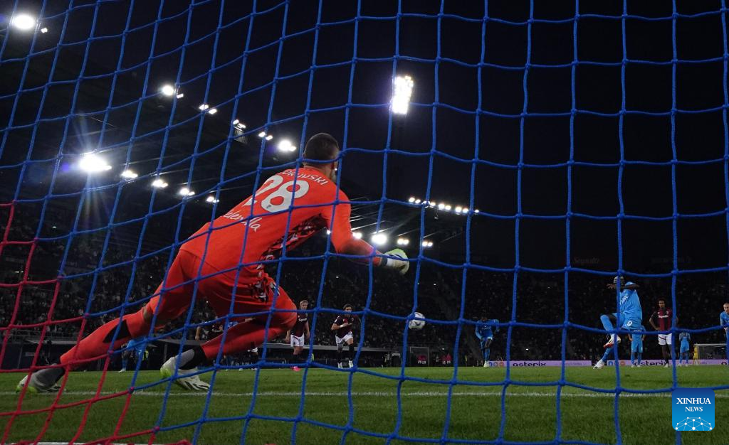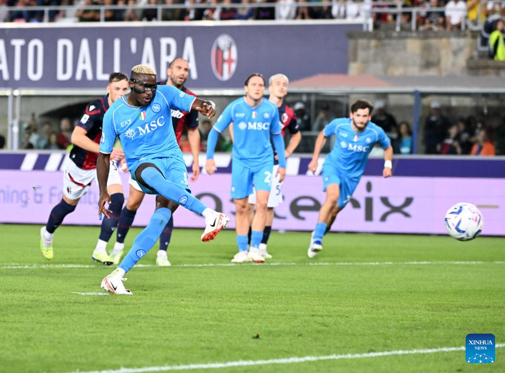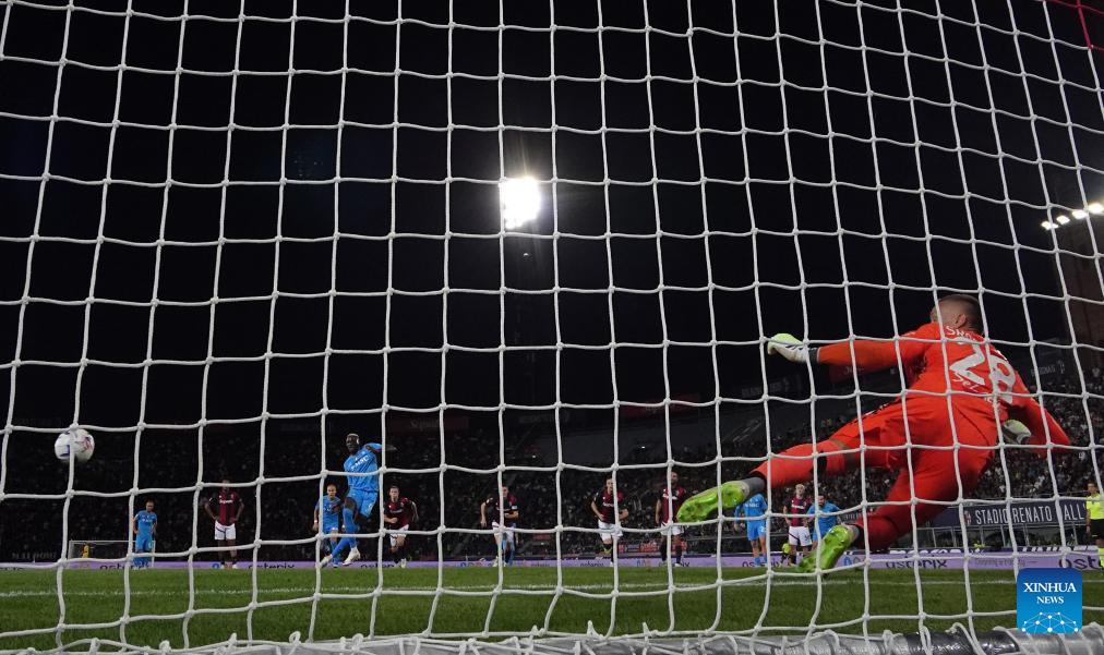 Napoli's Victor Osimhen misses the penalty kick during a Serie A football match between Bologna and Napoli in Bologna, Italy, on Sept.24, 2023. (Photo by Alberto Lingria/Xinhua)