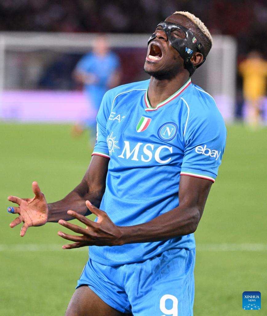 Napoli's Victor Osimhen reacts during a Serie A football match between Bologna and Napoli in Bologna, Italy, on Sept.24, 2023. (Photo by Alberto Lingria/Xinhua)