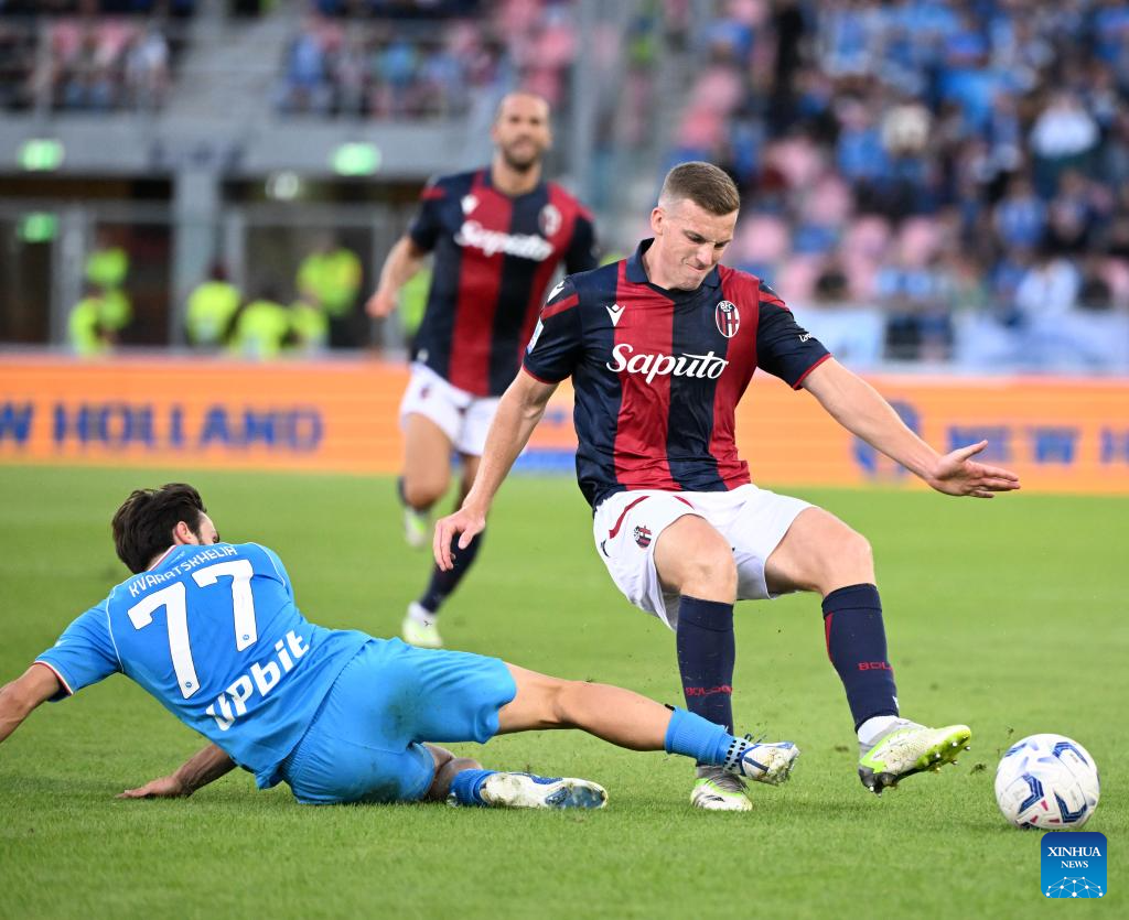 Napoli's Khvicha Kvaratskhelia (L) vies with Bologna's Lewis Ferguson during a Serie A football match between Bologna and Napoli in Bologna, Italy, on Sept.24, 2023. (Photo by Alberto Lingria/Xinhua)