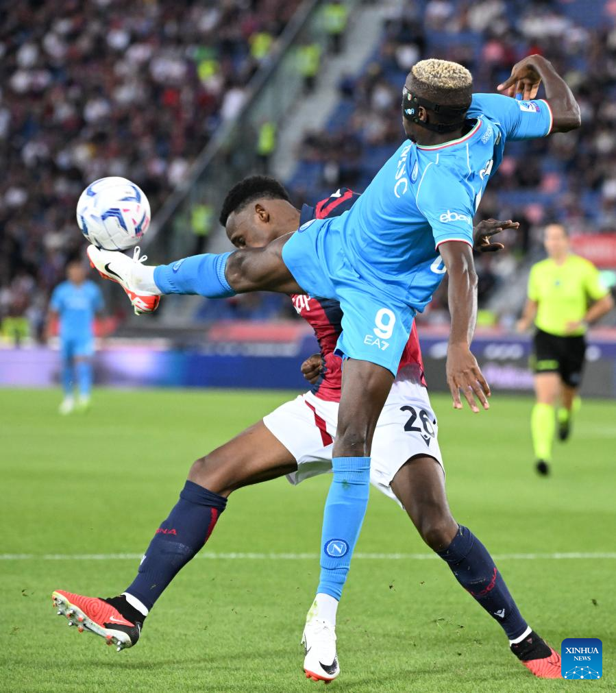 Napoli's Victor Osimhen (R) vies with Bologna's Jhon Lucumi during a Serie A football match between Bologna and Napoli in Bologna, Italy, on Sept.24, 2023. (Photo by Alberto Lingria/Xinhua)