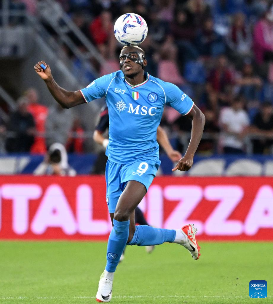 Napoli's Victor Osimhen is in action during a Serie A football match between Bologna and Napoli in Bologna, Italy, on Sept.24, 2023. (Photo by Alberto Lingria/Xinhua)