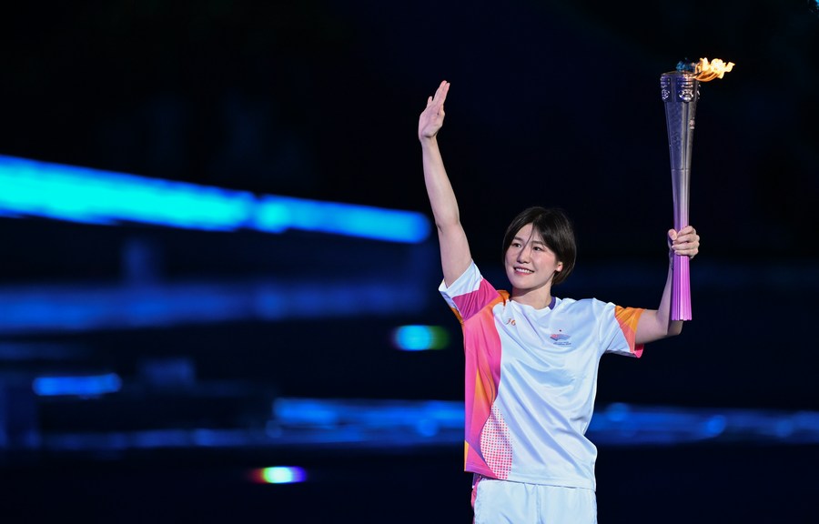 Ye relays the torch during the opening ceremony of the 19th Asian Games in Hangzhou on September 23, 2023. (Xinhua/Li Yibo)