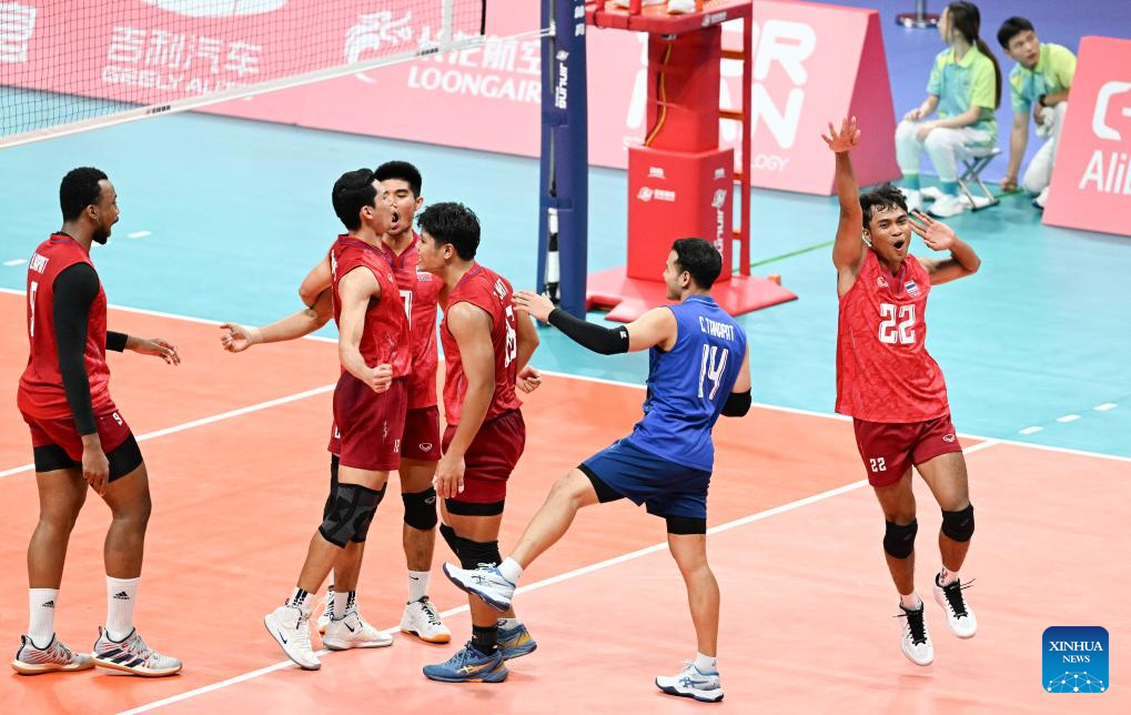 Players of Thailand celebrate scoring during the Volleyball Men's Classification 9th-10th match between Thailand and Kazakhstan at the 19th Asian Games in Shaoxing, east China's Zhejiang Province, Sept. 26, 2023. (Xinhua/Yang Guanyu)