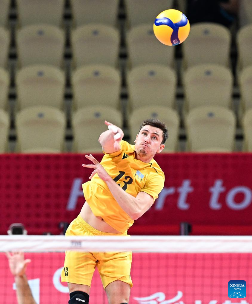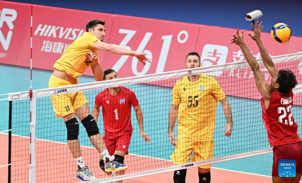 Vladislav Kunchenko (1st L) of Kazakhstan spikes the ball during the Volleyball Men's Classification 9th-10th match between Thailand and Kazakhstan at the 19th Asian Games in Shaoxing, east China's Zhejiang Province, Sept. 26, 2023. (Xinhua/Yang Guanyu)