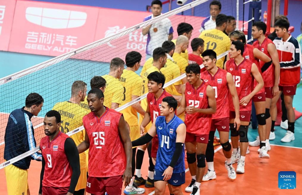 Players of Thailand and Kazakhstan greet each other after the Volleyball Men's Classification 9th-10th match between Thailand and Kazakhstan at the 19th Asian Games in Shaoxing, east China's Zhejiang Province, Sept. 26, 2023. (Xinhua/Yang Guanyu)
