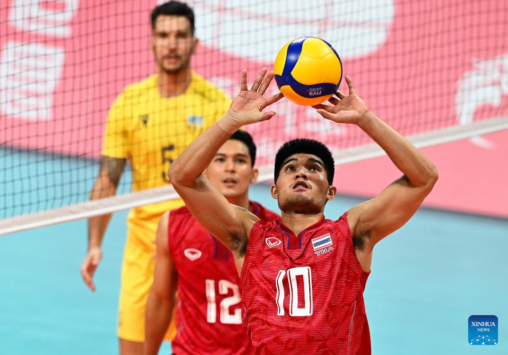 Boonyarid Wongtorn (R) of Thailand passes the ball during the Volleyball Men's Classification 9th-10th match between Thailand and Kazakhstan at the 19th Asian Games in Shaoxing, east China's Zhejiang Province, Sept. 26, 2023. (Xinhua/Yang Guanyu)