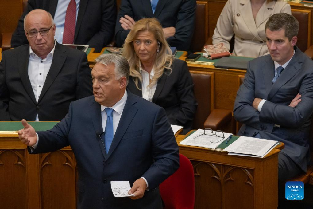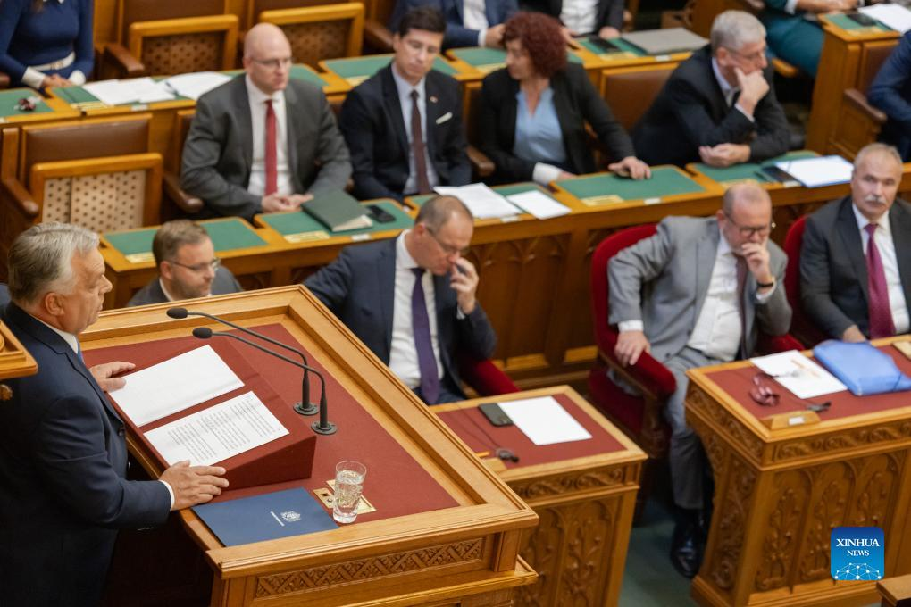 Hungarian Prime Minister Viktor Orban (1st L) speaks in parliament to open the autumn session in Budapest, Hungary, on Sept. 25, 2023. Orban said on Monday there is "no urgency" to ratify Sweden's accession to NATO, and called for "respect" from the Nordic country. (Photo by Attila Volgyi/Xinhua)