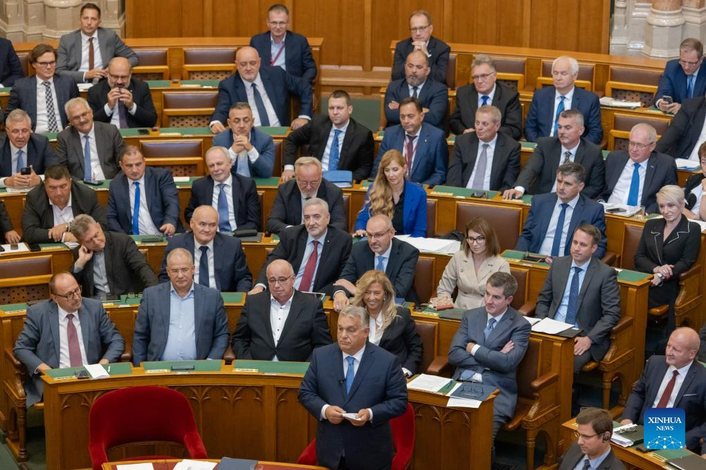 Hungarian Prime Minister Viktor Orban (Front) speaks in parliament to open the autumn session in Budapest, Hungary, on Sept. 25, 2023. Orban said on Monday there is "no urgency" to ratify Sweden's accession to NATO, and called for "respect" from the Nordic country. (Photo by Attila Volgyi/Xinhua)