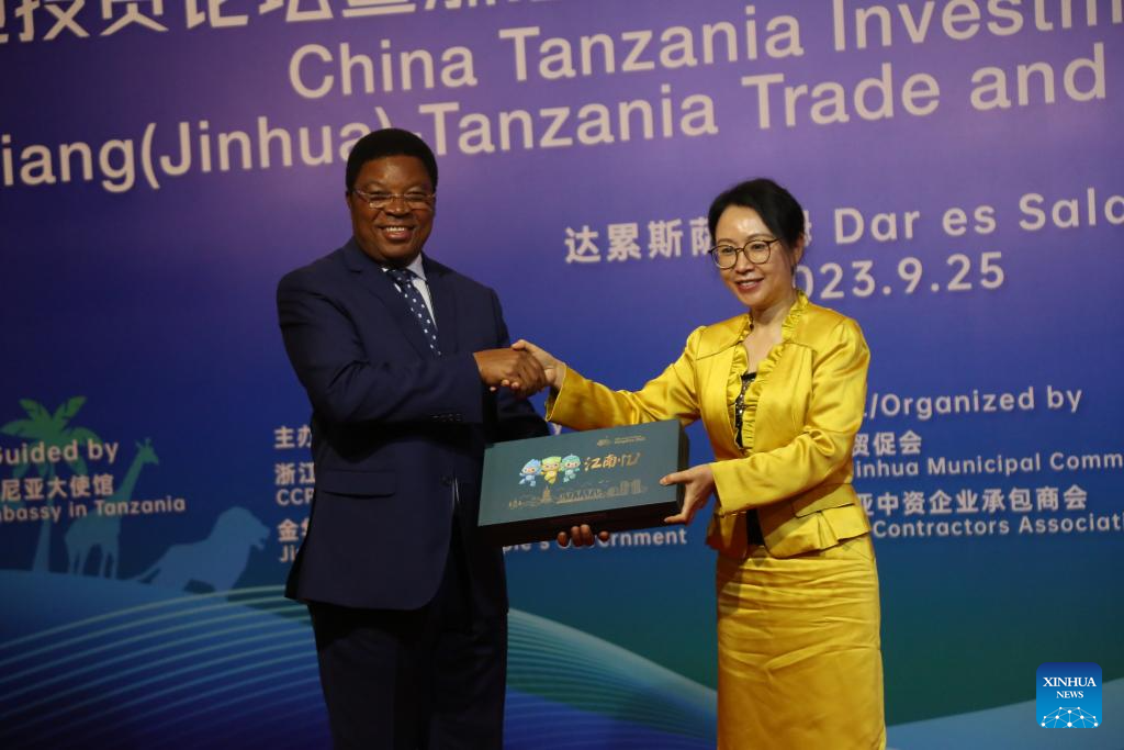 Tanzanian Prime Minister Kassim Majaliwa (L) shakes hands with Chen Mingjian, Chinese ambassador to Tanzania, at the China Tanzania Investment Forum Zhejiang (Jinhua) -Tanzania Trade and Investment Conference in Dar es Salaam, Tanzania, Sept. 25, 2023. (Photo by Emmanuel Herman/Xinhua)