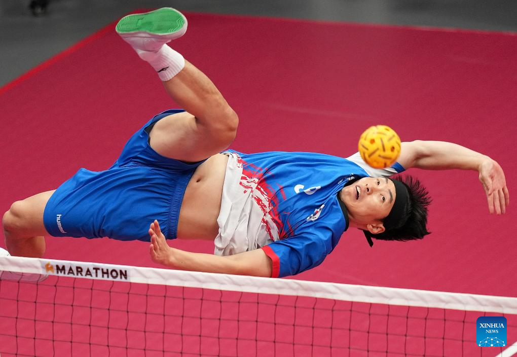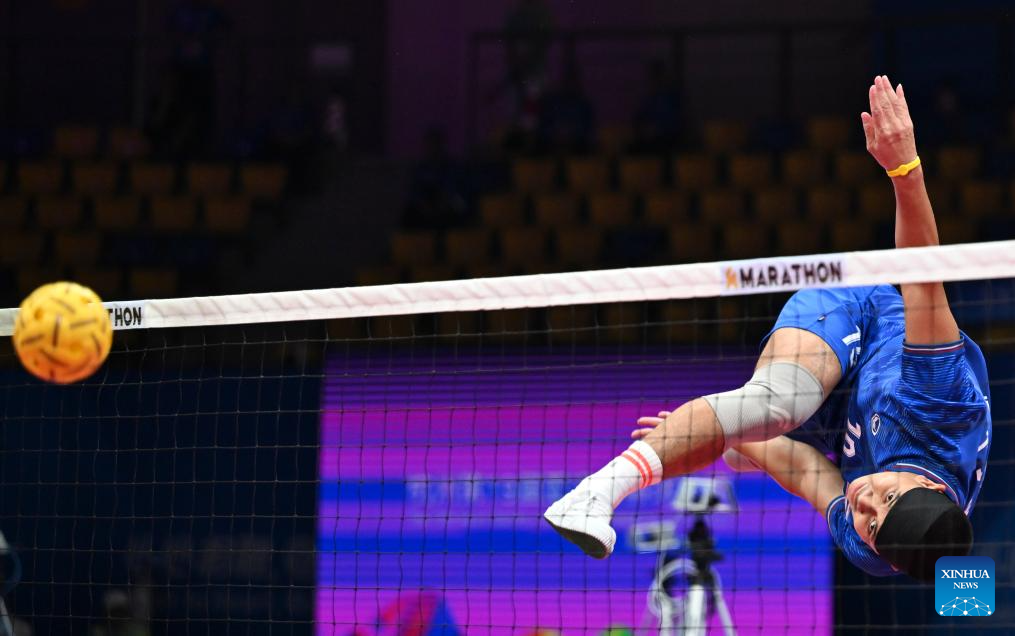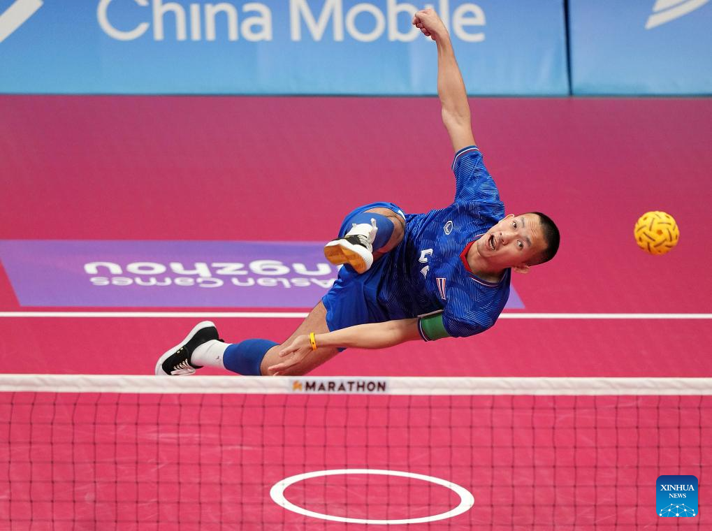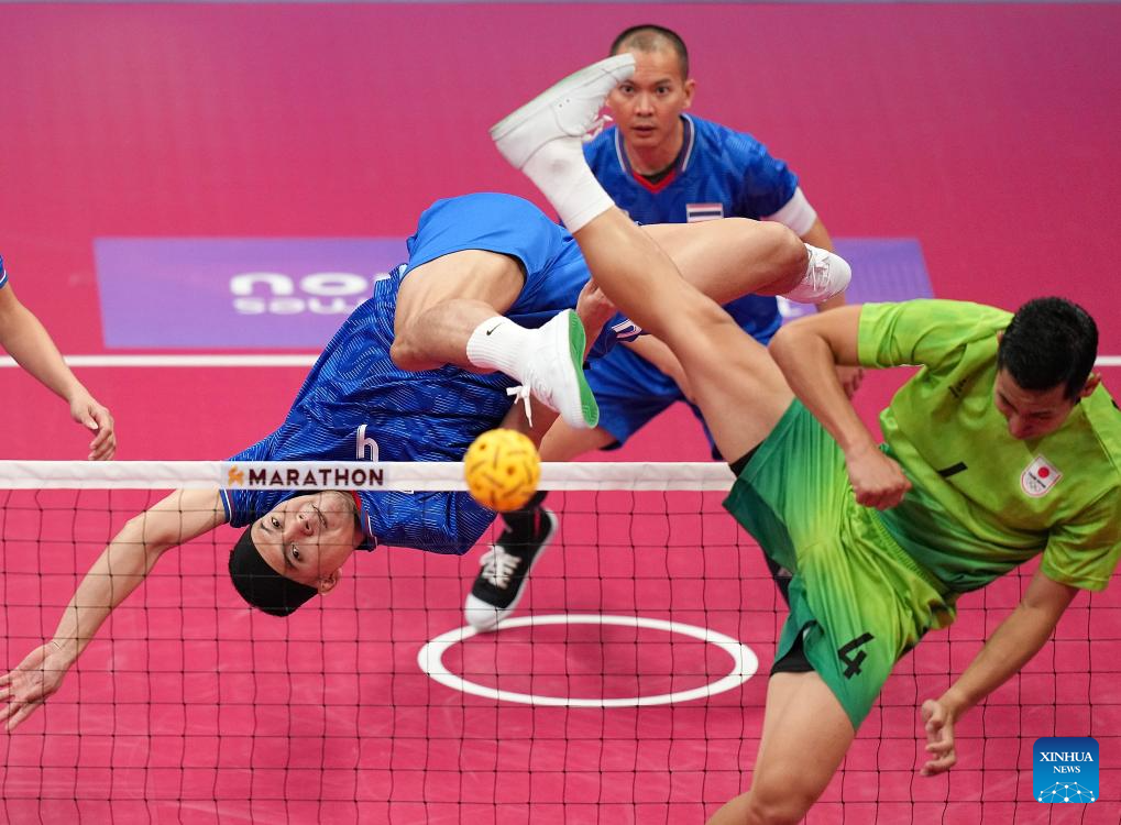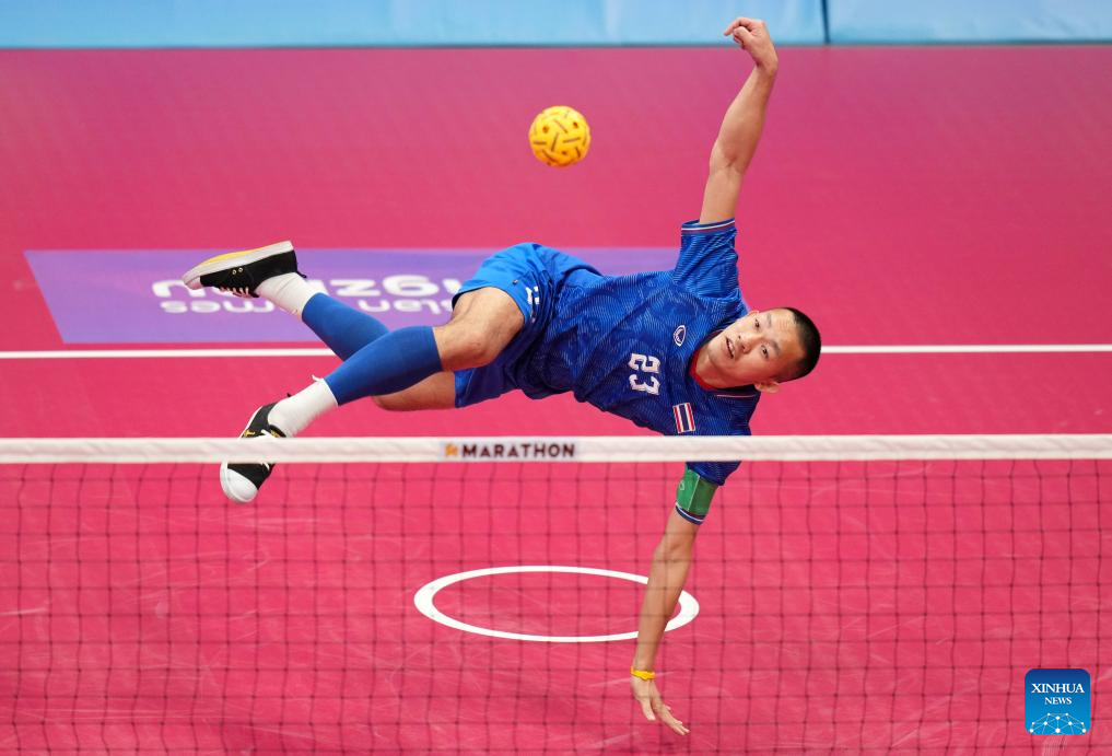 Varayut Jantarasena of Thailand competes during the Men's Team Regu Preliminary match of Sepaktakraw between Thailand and Japan at the 19th Asian Games in Jinhua, east China's Zhejiang Province, Sept. 26, 2023. (Xinhua/Chen Zhonghao)