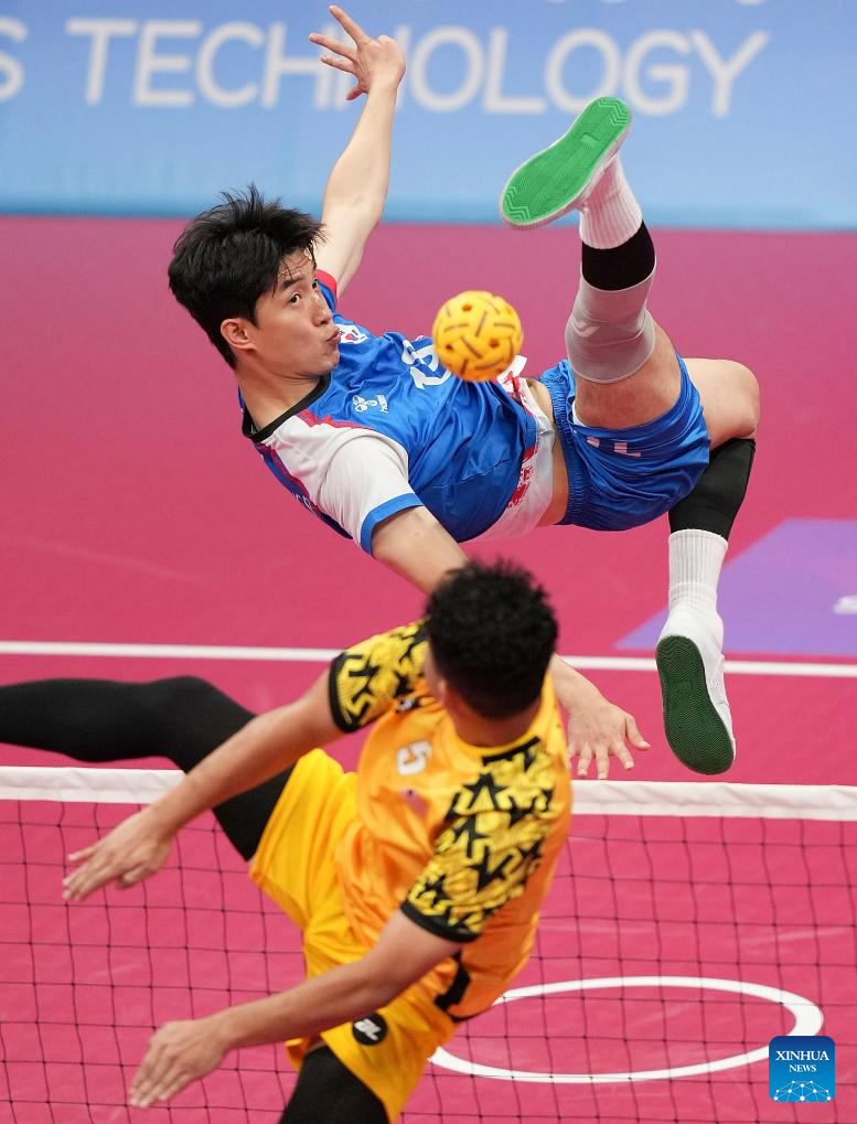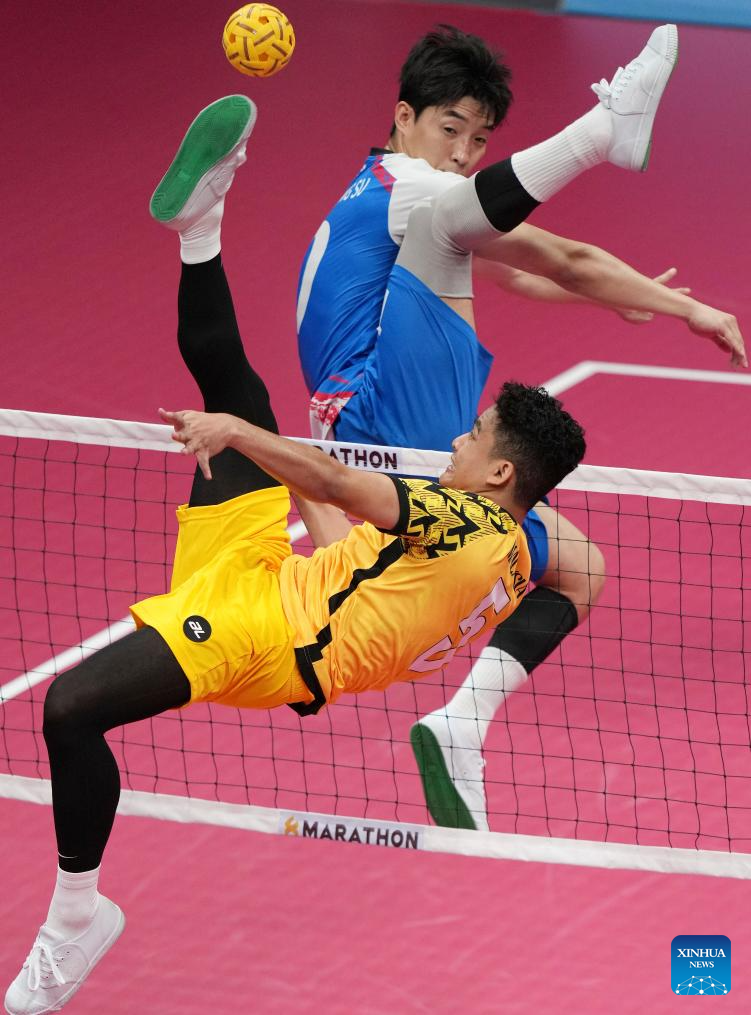 Bin Alias Mohamad Azlan (front) of Malaysia competes during the Men's Team Regu Preliminary match of Sepaktakraw between Malaysia and South Korea at the 19th Asian Games in Jinhua, east China's Zhejiang Province, Sept. 26, 2023. (Xinhua/Chen Zhonghao)