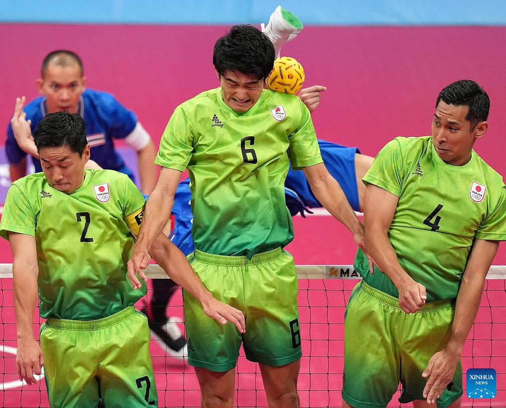 Takano Seiya (L, front), Narawa Wataru (C, front) and Naito Toshitaka of Japan compete during the Men's Team Regu Preliminary match of Sepaktakraw between Thailand and Japan at the 19th Asian Games in Jinhua, east China's Zhejiang Province, Sept. 26, 2023. (Xinhua/Chen Zhonghao)