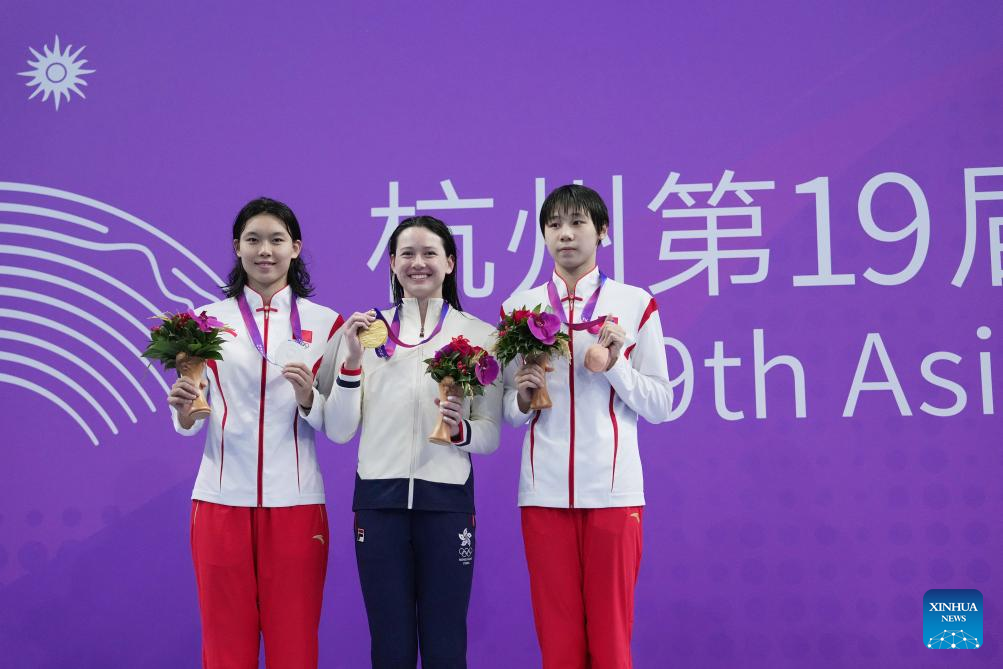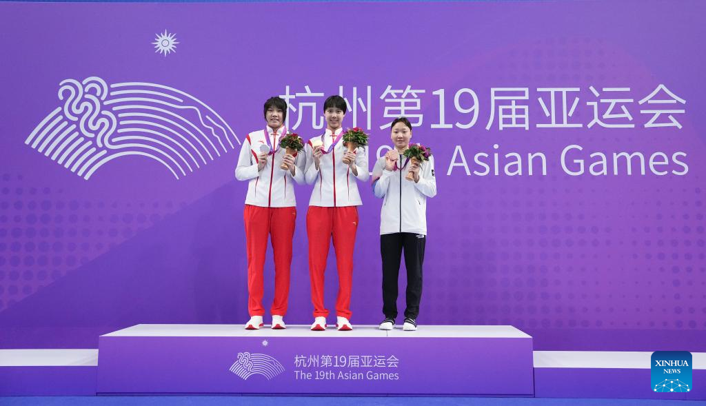 (From L-R) Silver medallist Ma Yonghui of China, gold medallist Li Bingjie of China and bronze medallist Kobori Waka of Japan attend the awarding ceremony of the women's 400m freestyle swimming at the 19th Asian Games in Hangzhou, east China's Zhejiang Province, Sept. 26, 2023. (Xinhua/Xue Yuge)