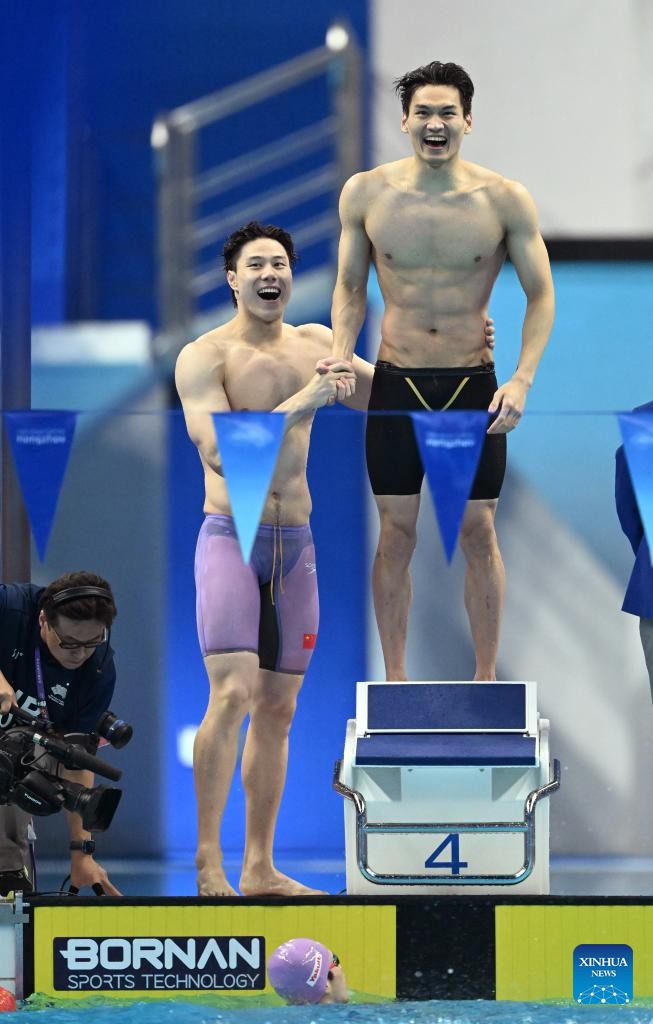 Qin Haiyang (L) and Xu Jiayu of China react during the Men's 4x100m Medley Relay Final of Swimming at the 19th Asian Games in Hangzhou, east China's Zhejiang Province, Sept. 26, 2023. (Xinhua/Xue Yuge)