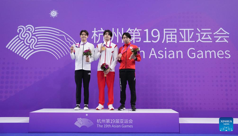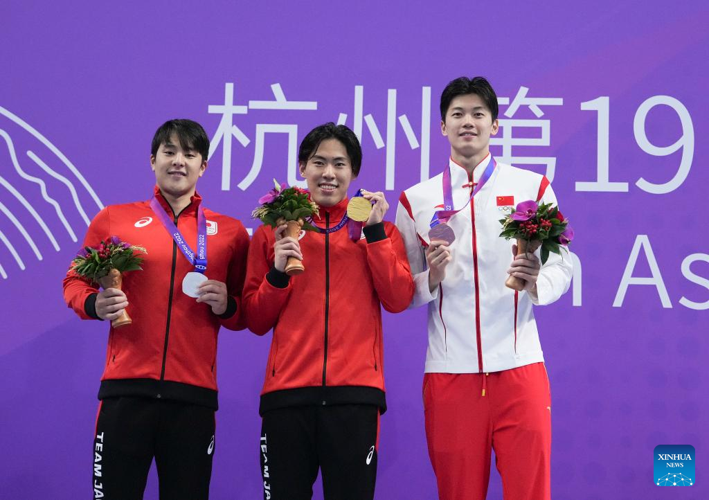 (From L-R) Silver medallist Seto Daiya of Japan, gold medallist Honda Tomoru of Japan and bronze medallist Wang Shun of China attend the awarding ceremony of the men's 400m individual medley swimming at the 19th Asian Games in Hangzhou, east China's Zhejiang Province, Sept. 26, 2023. (Xinhua/Xue Yuge)