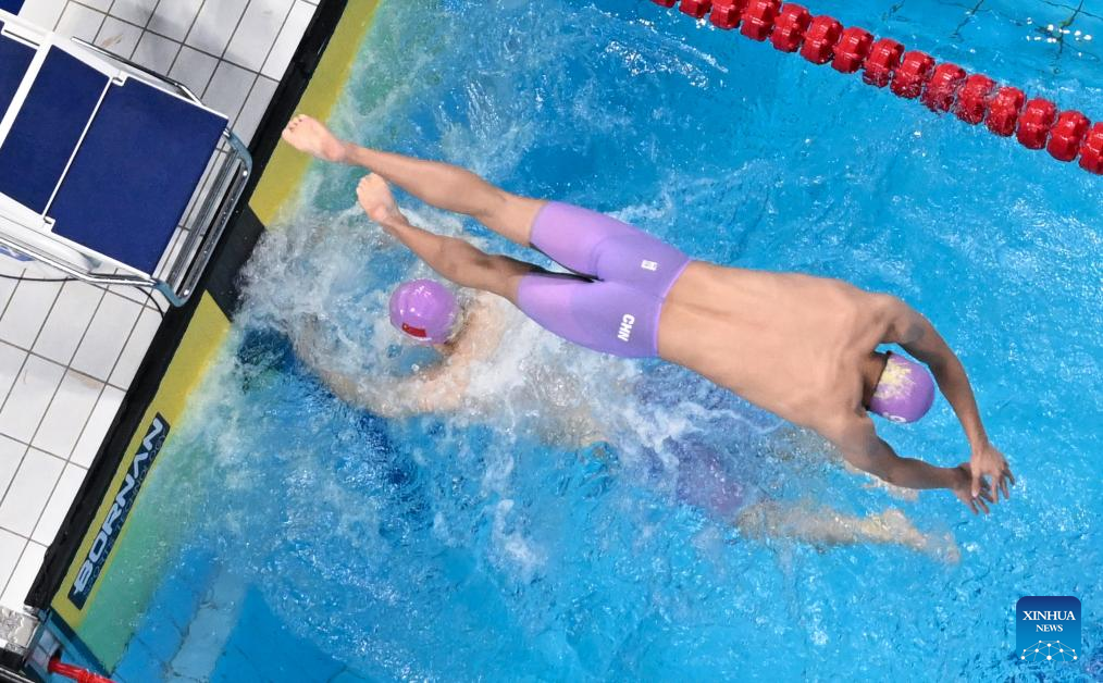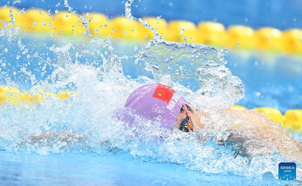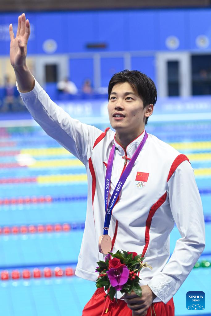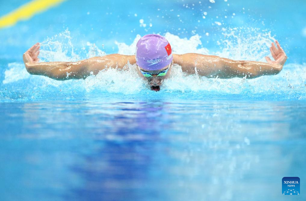 Pan Zhanle of China competes during the Men's 4×100m Medley Relay Final of Swimming at the 19th Asian Games in Hangzhou, east China's Zhejiang Province, Sept. 26, 2023. (Xinhua/Huang Zongzhi)