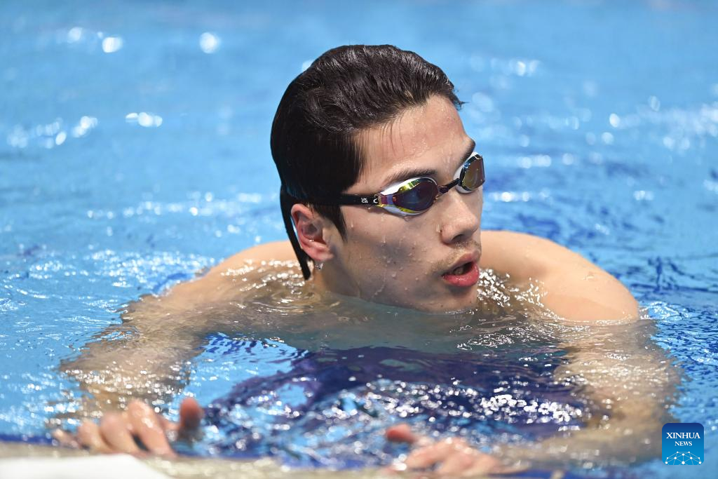Wang Shun of China reacts during the Men's 400m Individual Medley Final of Swimming at the 19th Asian Games in Hangzhou, east China's Zhejiang Province, Sept. 26, 2023. (Xinhua/Huang Zongzhi)