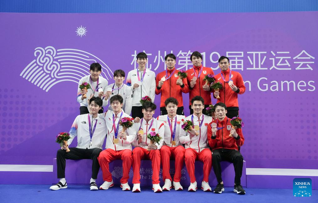 Gold medallists of Team China, silver medallists of Team South Korea and bronze medallist of Team Japan attend the awarding ceremony of the Men's 4x100m Medley Relay swimming at the 19th Asian Games in Hangzhou, east China's Zhejiang Province, Sept. 26, 2023. (Xinhua/Xue Yuge)