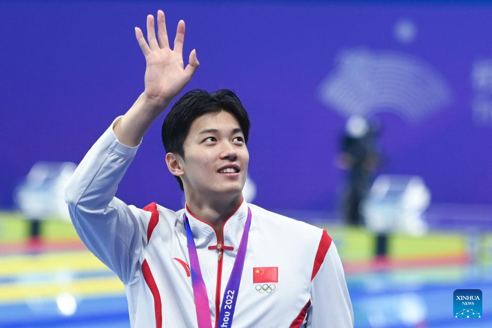 Wang Shun of China greets spectators after the Men's 400m Individual Medley Final of Swimming at the 19th Asian Games in Hangzhou, east China's Zhejiang Province, Sept. 26, 2023. (Xinhua/Huang Zongzhi)