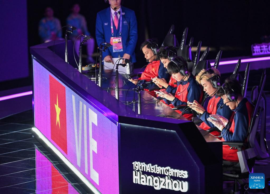 Team Vietnam compete during the Arena of Valor Asian Games Version Bronze Medal Match of Esports between Thailand and Vietnam at the 19th Asian Games in Hangzhou, east China's Zhejiang Province, Sept. 26, 2023. (Xinhua/Yan Linyun)