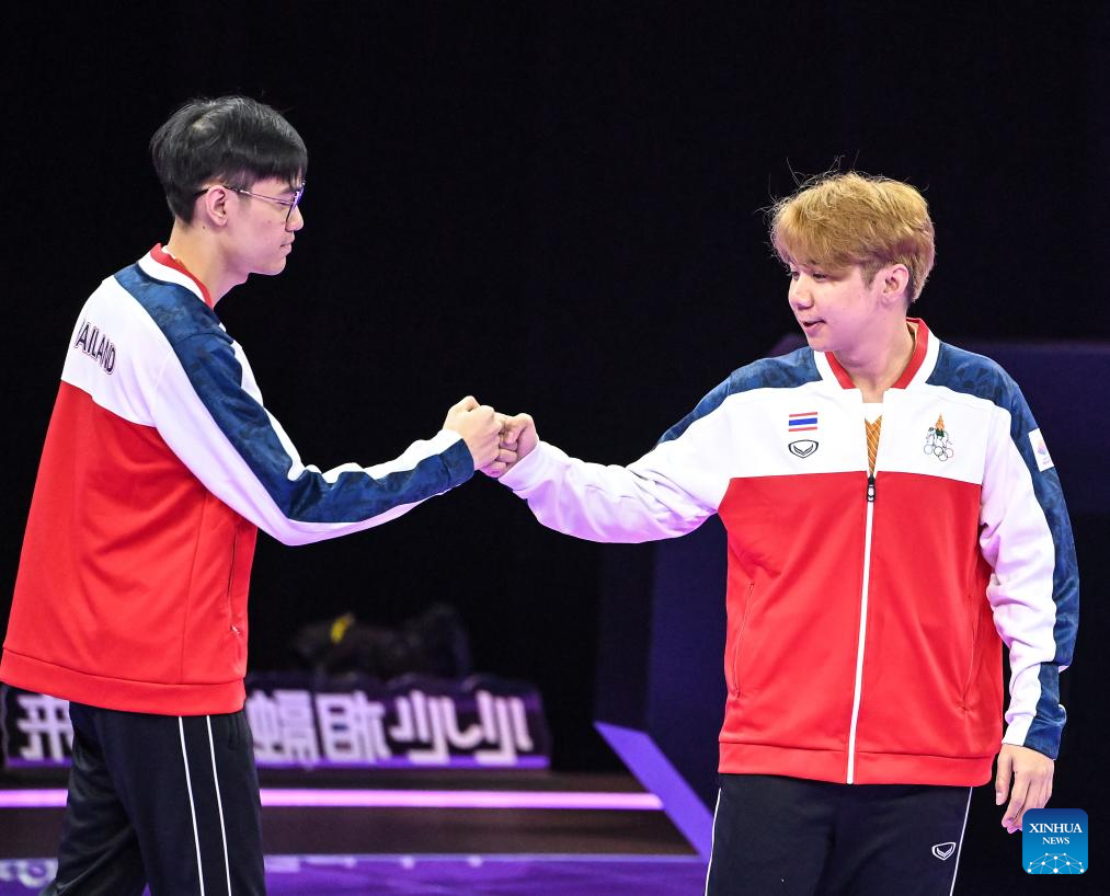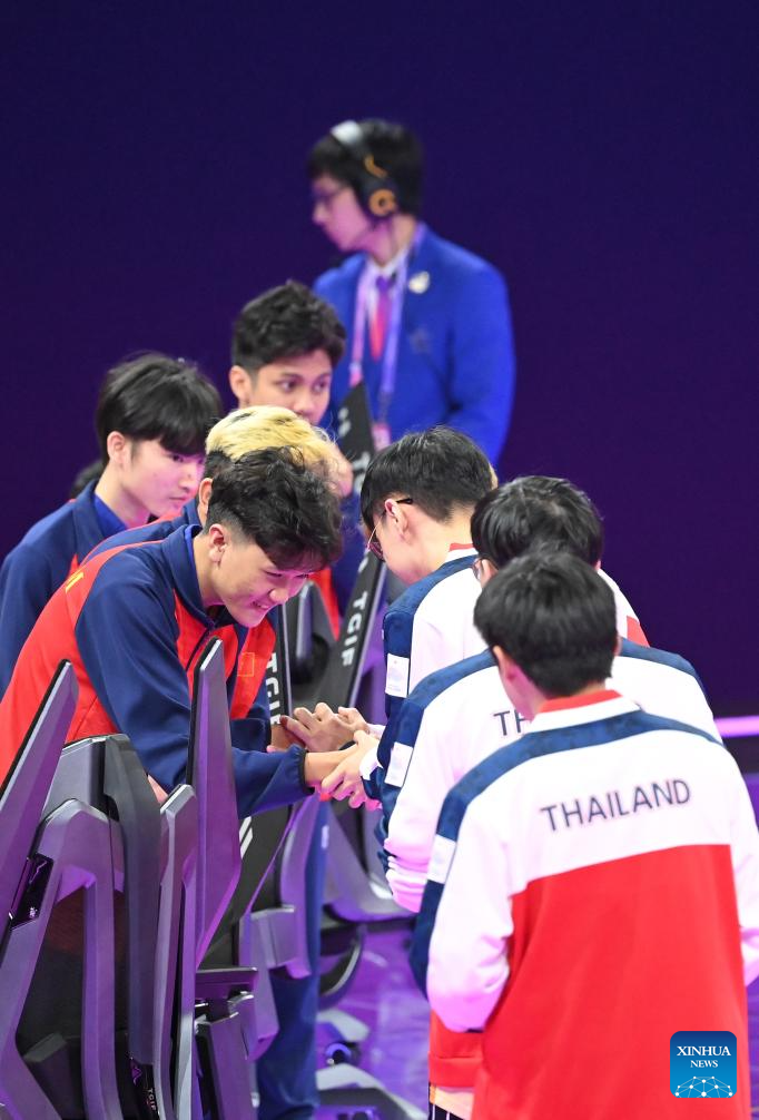 Players of team Thailand shake hands with team Vietnam after the Arena of Valor Asian Games Version Bronze Medal Match of Esports at the 19th Asian Games in Hangzhou, east China's Zhejiang Province, Sept. 26, 2023. (Xinhua/Yan Linyun)