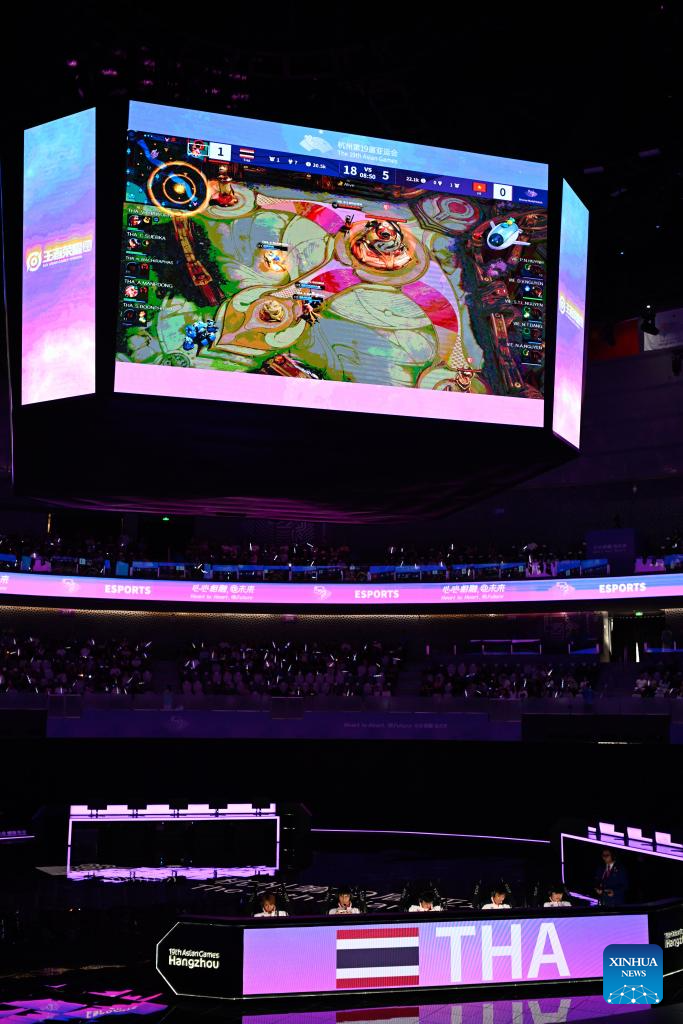 Team Thailand compete during the Arena of Valor Asian Games Version Bronze Medal Match of Esports between Thailand and Vietnam at the 19th Asian Games in Hangzhou, east China's Zhejiang Province, Sept. 26, 2023. (Xinhua/Yan Linyun)