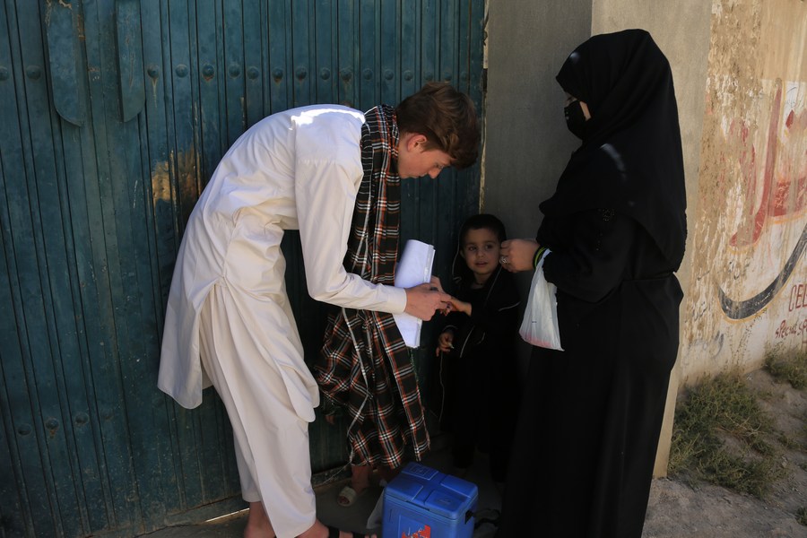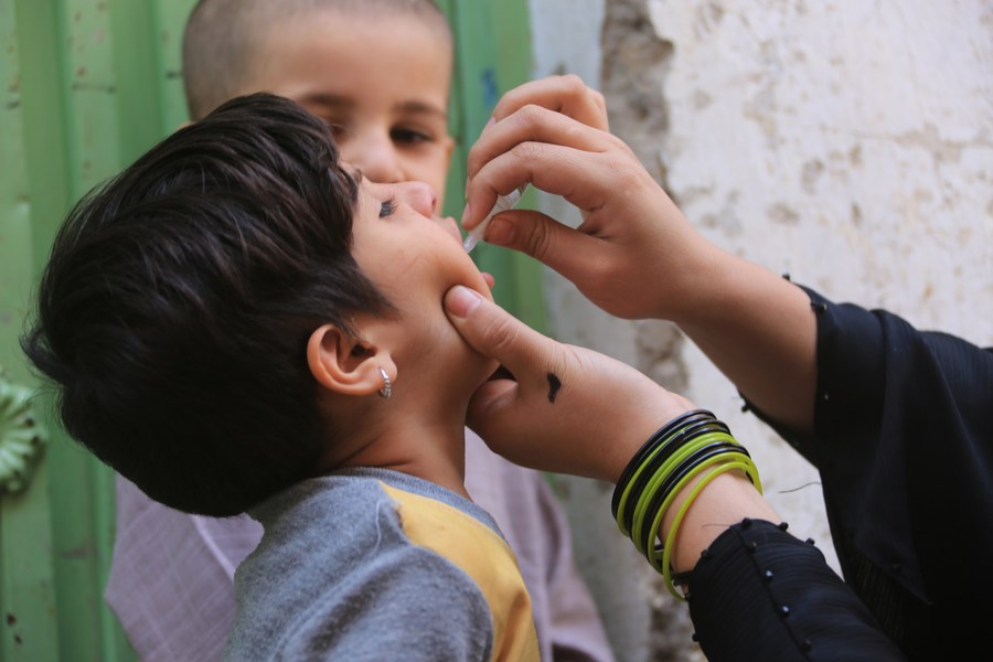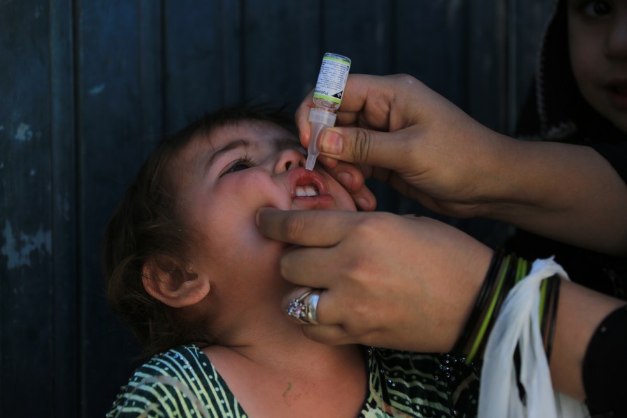 A health worker gives a dose of anti-polio vaccine to a child in Kabul, Afghanistan, Sept. 25, 2023. (Photo by Saifurahman Safi/Xinhua)