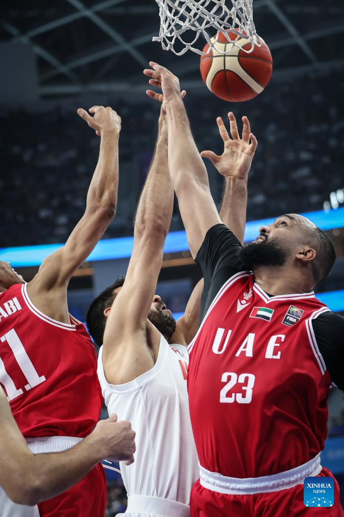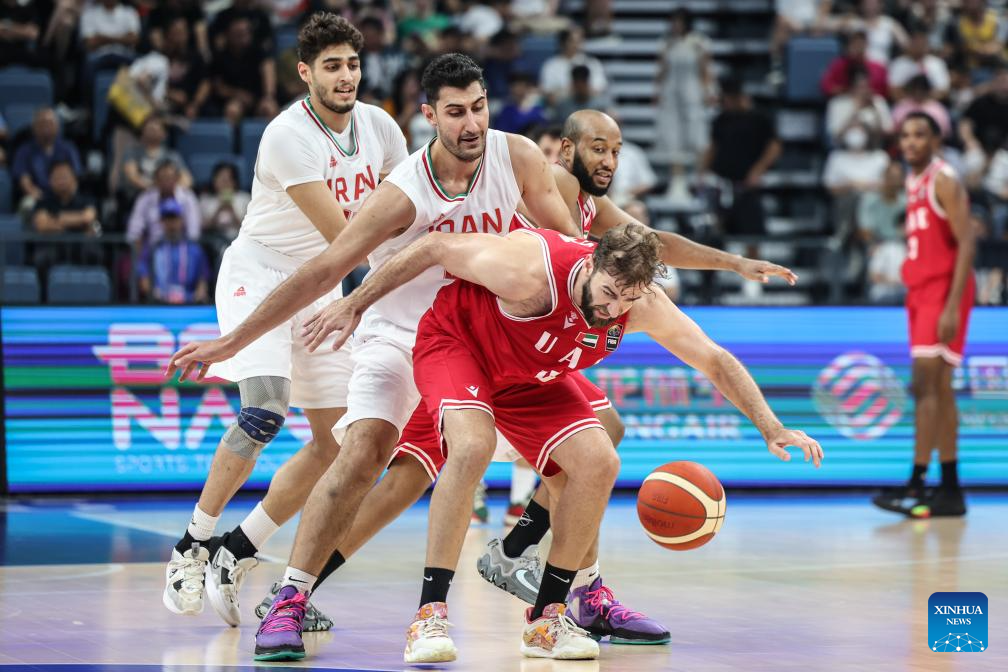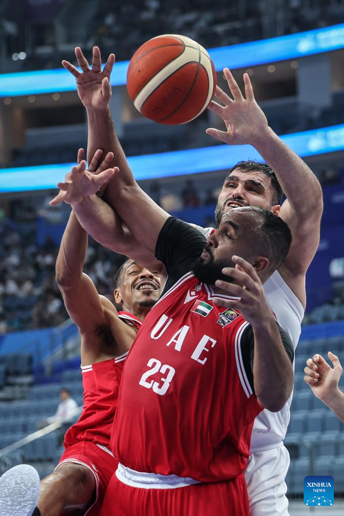 Qais Omar Ahmed Alshabebi (R) of the United Arab Emirates grabs a rebound during the Men's Preliminary Round match of Basketball between Iran and the United Arab Emirates at the 19th Asian Games in Hangzhou, east China's Zhejiang Province, Sept. 26, 2023. (Xinhua/Pan Yulong)