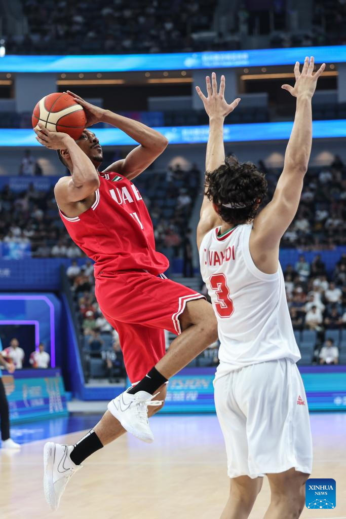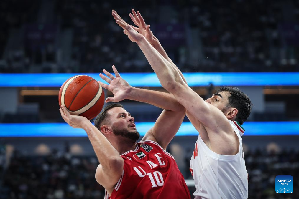 Jasim Mohamed Jabir Ahmed Almaazmi (front) of the United Arab Emirates competes during the Men's Preliminary Round match of Basketball between Iran and the United Arab Emirates at the 19th Asian Games in Hangzhou, east China's Zhejiang Province, Sept. 26, 2023. (Xinhua/Pan Yulong)