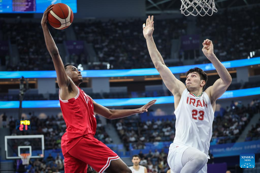 Meisam Mirzaeitalarposhti (R) of Iran goes for a layup during the Men's Preliminary Round match of Basketball between Iran and the United Arab Emirates at the 19th Asian Games in Hangzhou, east China's Zhejiang Province, Sept. 26, 2023. (Xinhua/Pan Yulong)