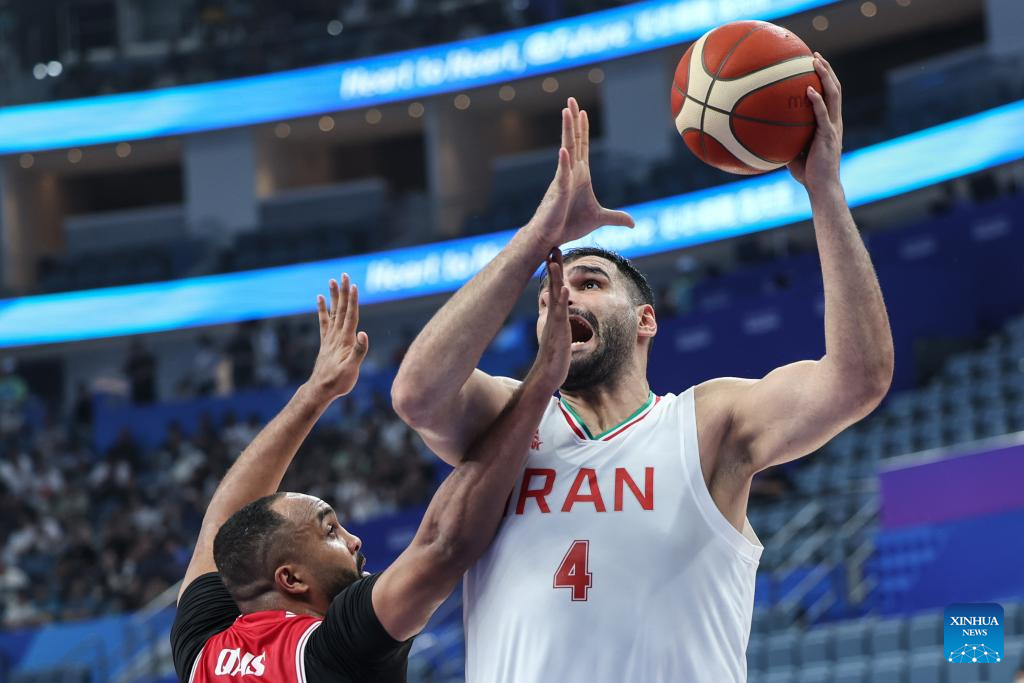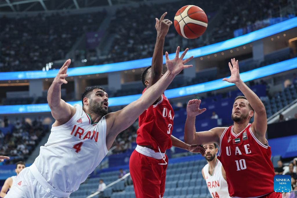 Meisam Mirzaeitalarposhti (R, top) of Iran grabs a rebound during the Men's Preliminary Round match of Basketball between Iran and the United Arab Emirates at the 19th Asian Games in Hangzhou, east China's Zhejiang Province, Sept. 26, 2023. (Xinhua/Pan Yulong)