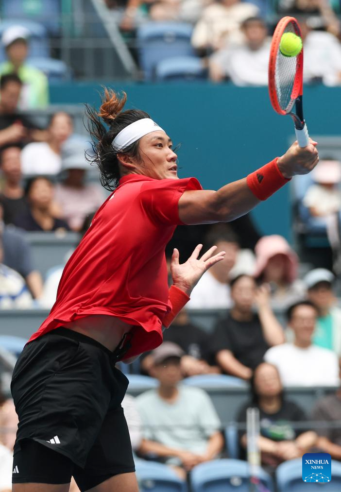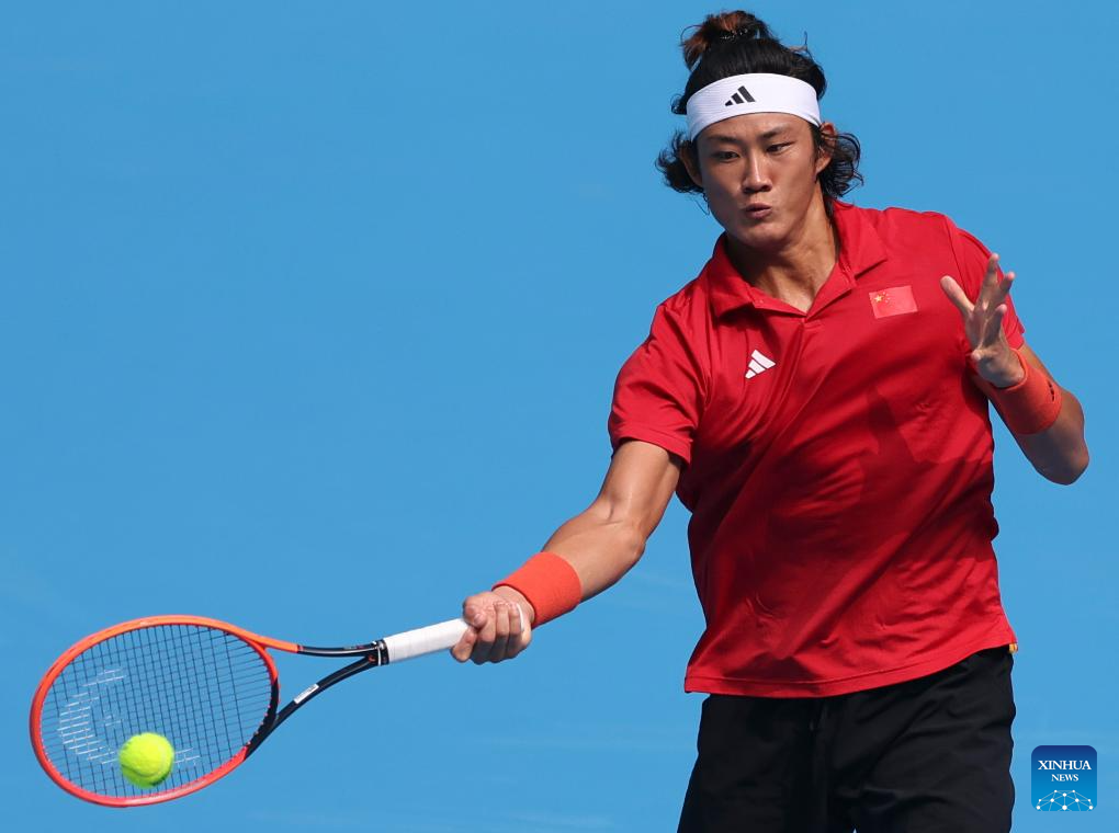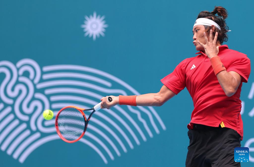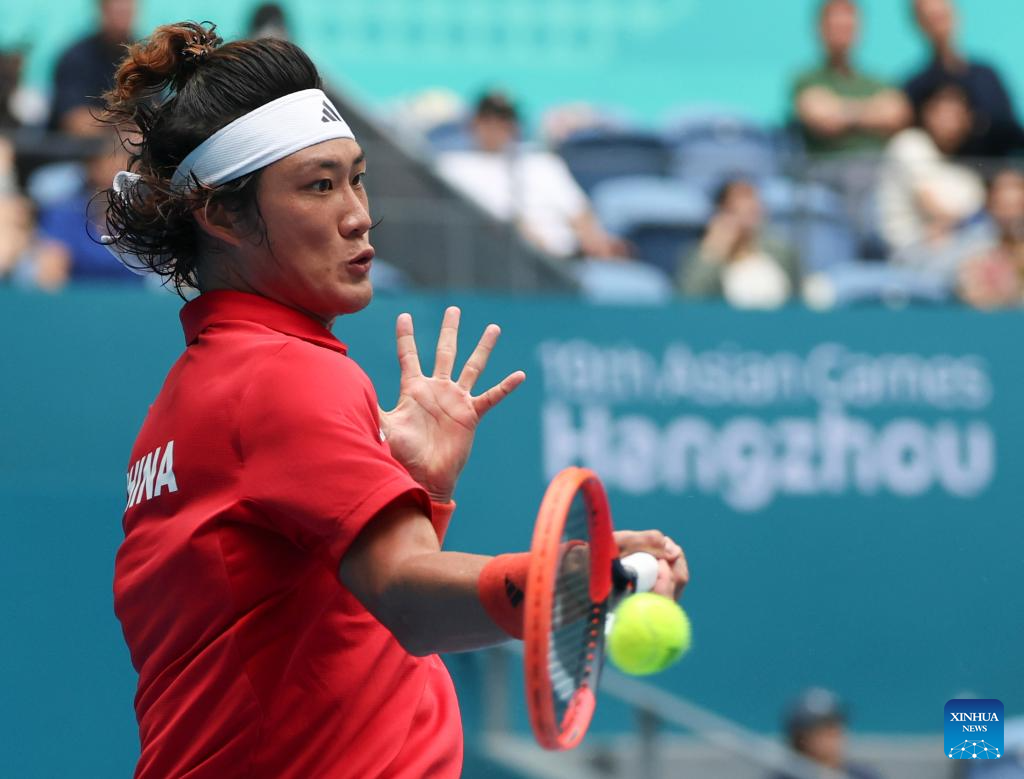 Zhang Zhizhen of China competes during the Men's Singles Round match of Tennis between Zhang Zhizhen of China and Muhammad Rifqi Fitriadi of Indonesia at the 19th Asian Games in Hangzhou, east China's Zhejiang Province, Sept. 26, 2023. (Xinhua/Meng Chenguang)
