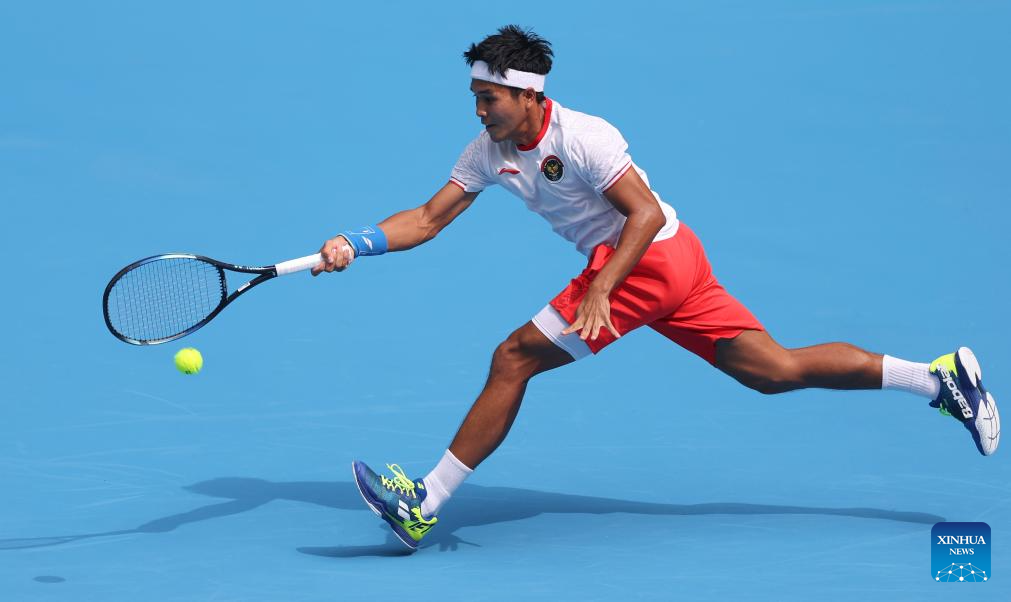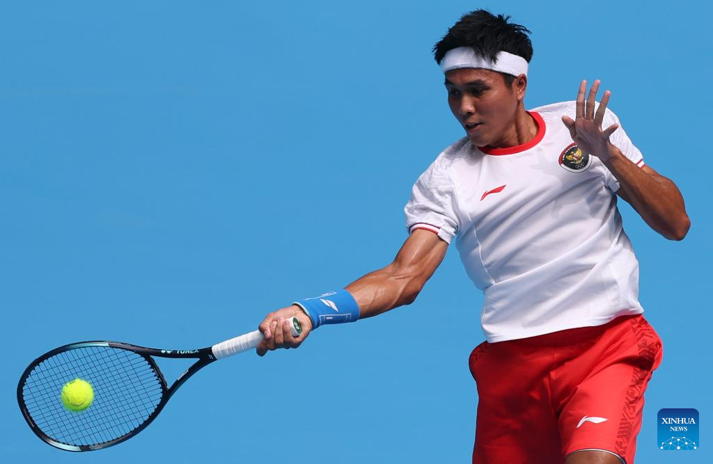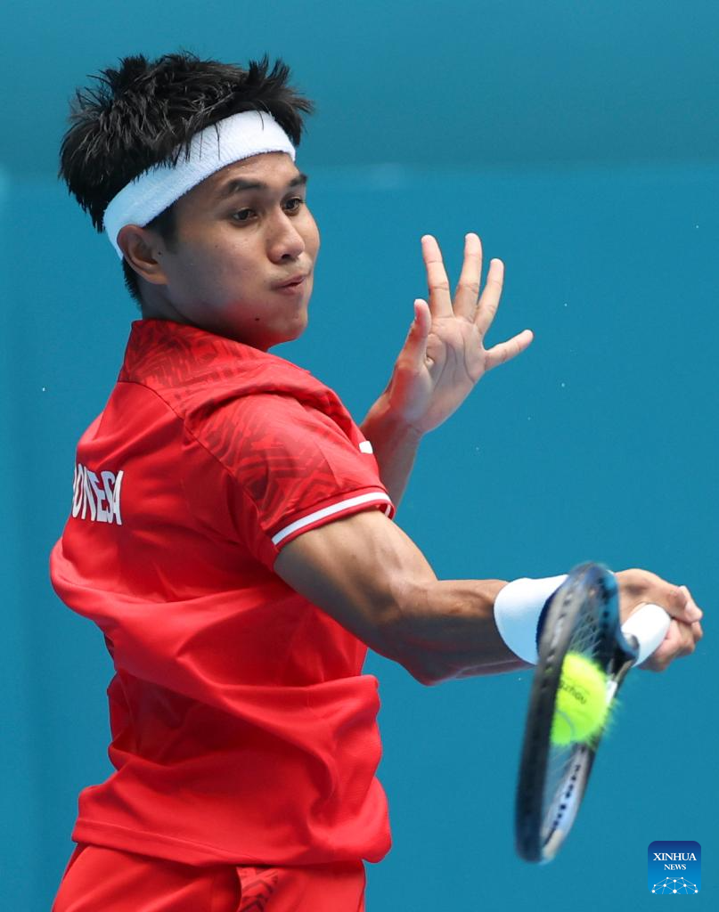 Muhammad Rifqi Fitriadi of Indonesia competes during the Men's Singles Round match of Tennis between Zhang Zhizhen of China and Muhammad Rifqi Fitriadi of Indonesia at the 19th Asian Games in Hangzhou, east China's Zhejiang Province, Sept. 26, 2023. (Xinhua/Meng Chenguang)