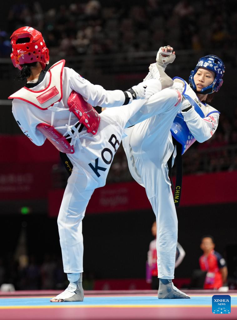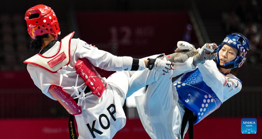 Luo Zongshi (R) of China competes against Kim Yujin of South Korea during the Women's 57kg Semifinal of Taekwondo at the 19th Asian Games in Hangzhou, east China's Zhejiang Province, Sept. 26, 2023. (Xinhua/Jiang Wenyao)