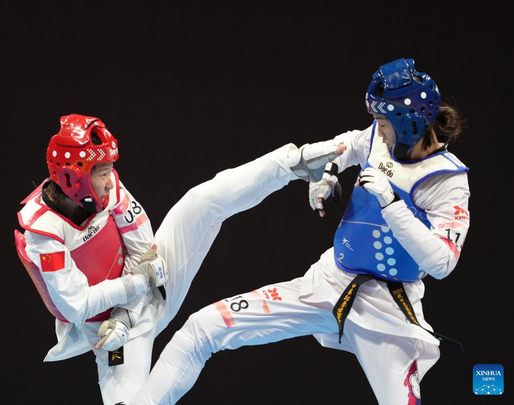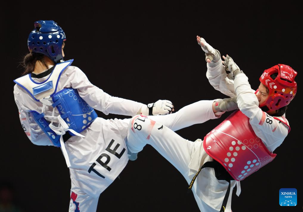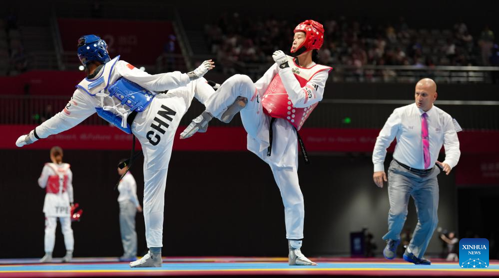 Zuo Ju (R) of China competes against Lin Wei Chun of Chinese Taipei during the Women's 53kg Quarterfinal of Taekwondo at the 19th Asian Games in Hangzhou, east China's Zhejiang Province, Sept. 26, 2023. (Xinhua/Jiang Wenyao)
