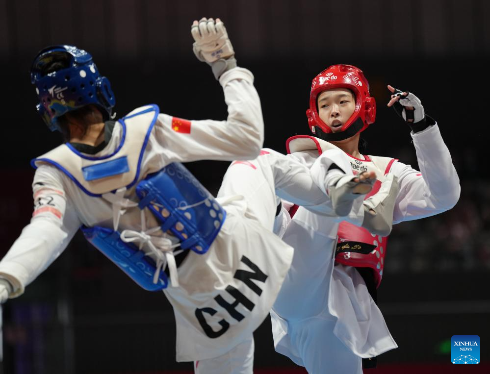 Zuo Ju (L) of China competes against Lin Wei Chun of Chinese Taipei during the Women's 53kg Quarterfinal of Taekwondo at the 19th Asian Games in Hangzhou, east China's Zhejiang Province, Sept. 26, 2023. (Xinhua/Jiang Wenyao)